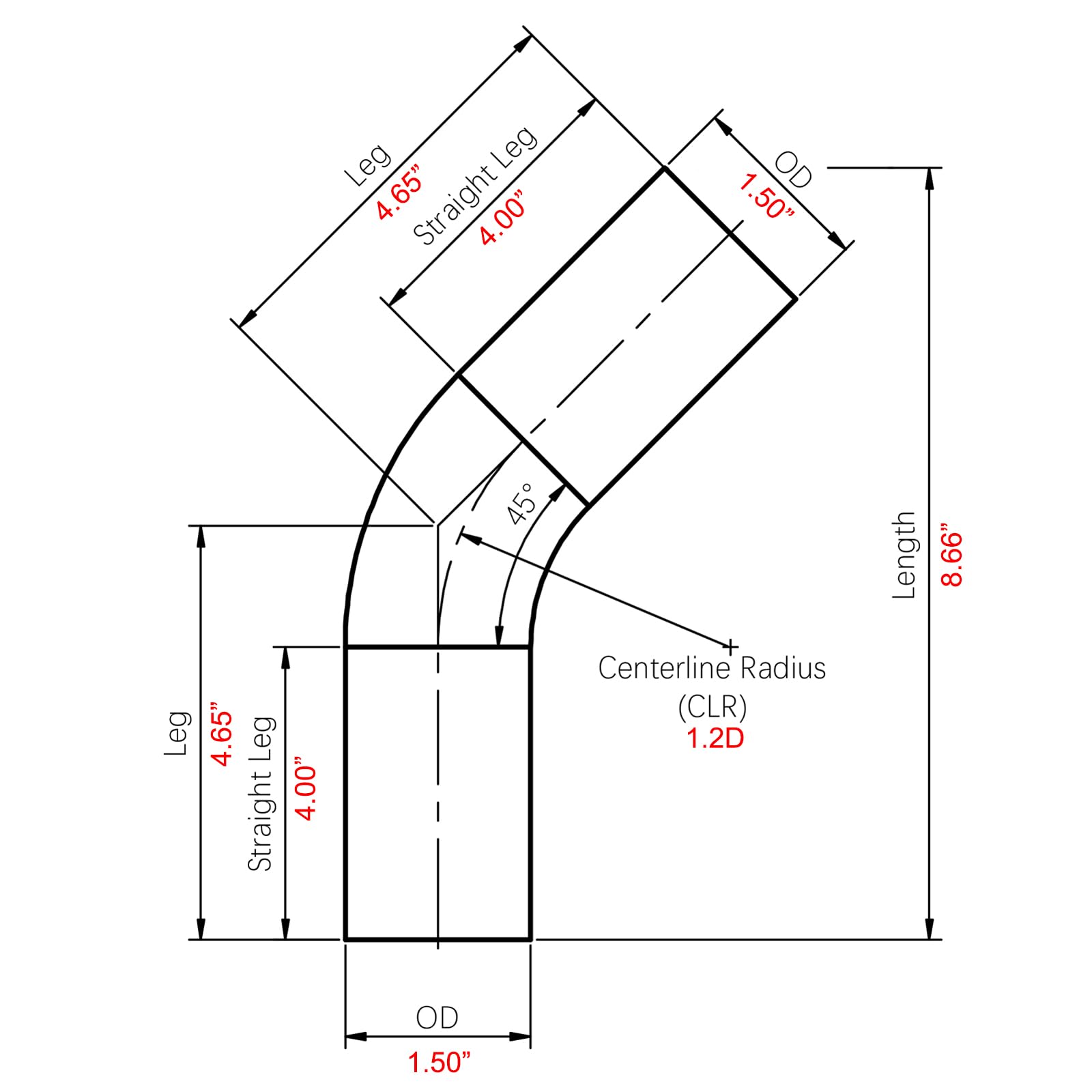 45 Degree bend, outside diameter: 1.5" (38mm), Leg Length: 4" (100mm), wall thickness: 0.059" (1.5mm)