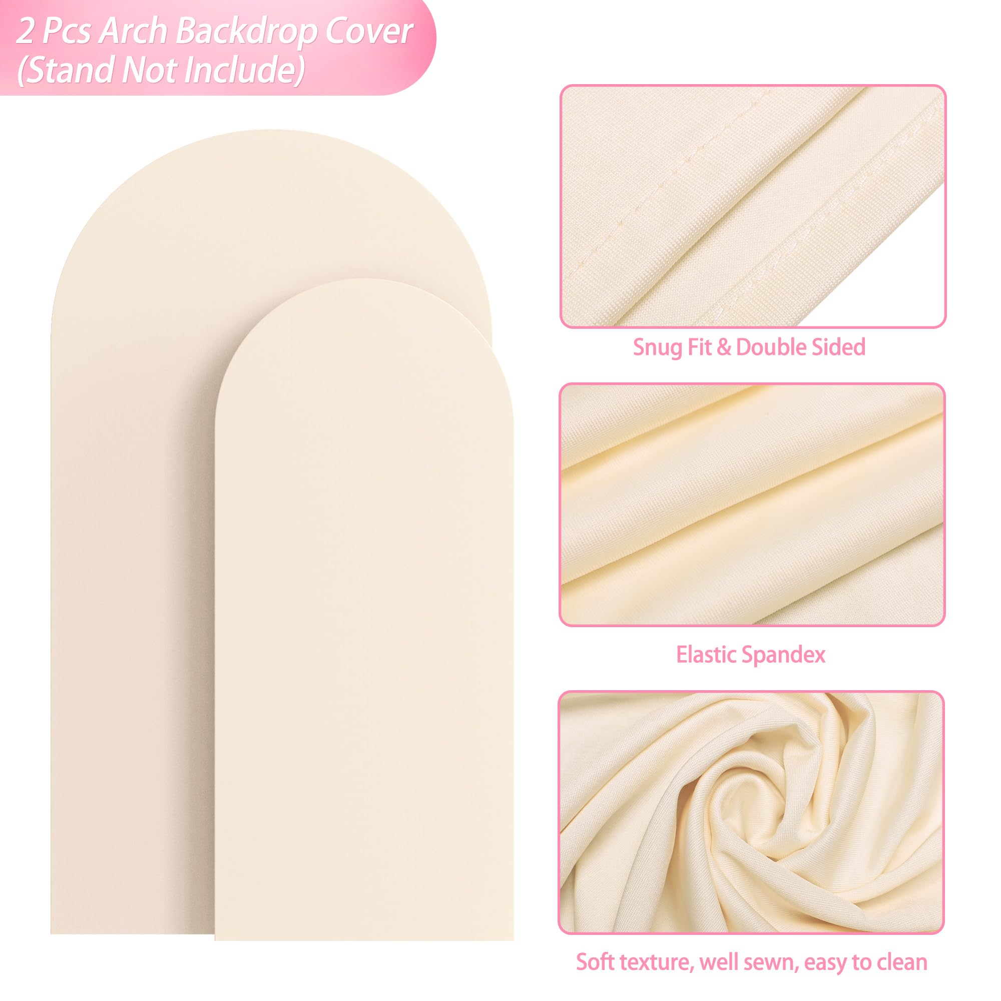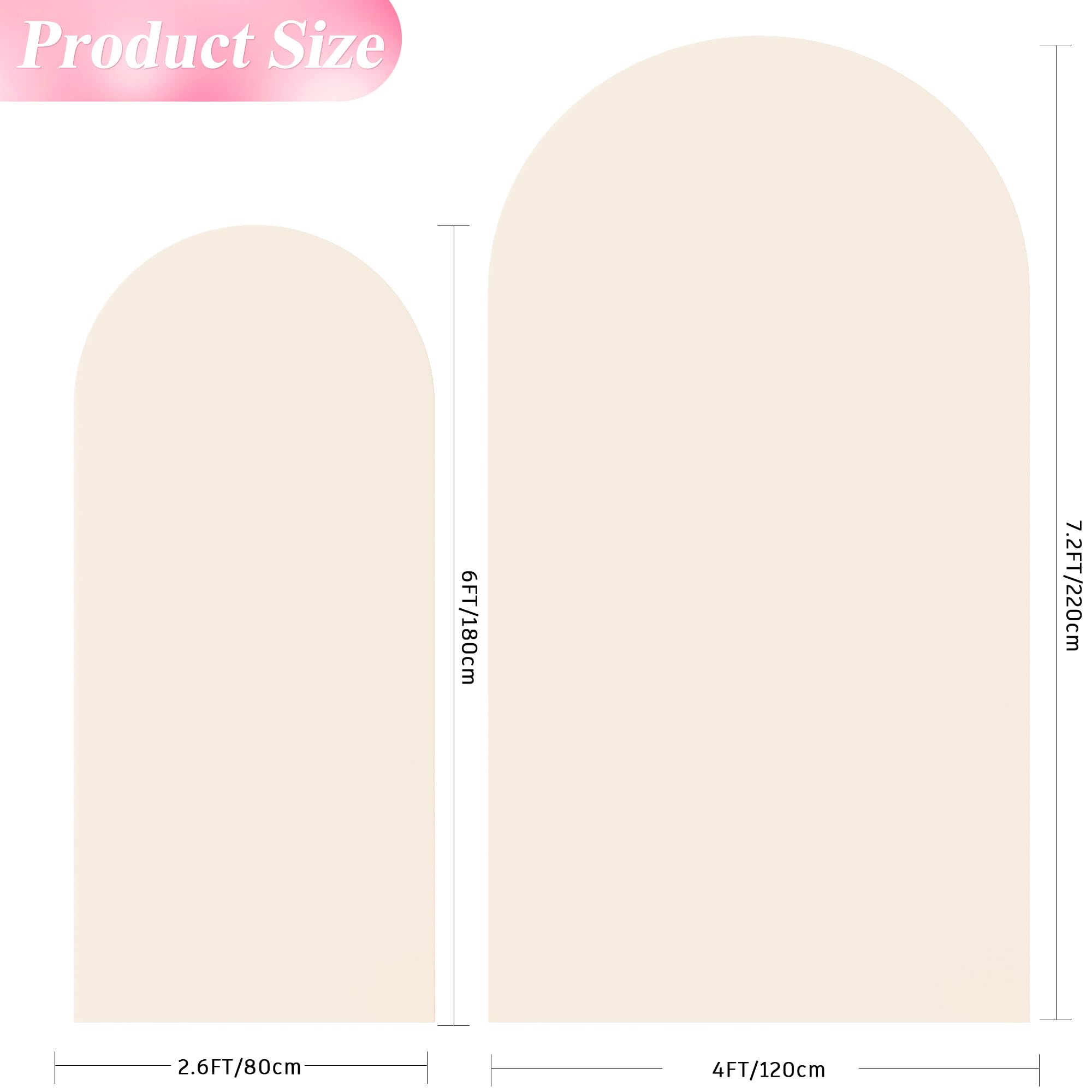 【Arch Covers Package】2 Piece wedding arch cover (Arch stand Not included). Material: Spandex. Color: Beige. Size: 7.2 x 4ft (HxW) / 6x2.6ft (HxW) . Decorate your party backdrop with our wedding arch covers to create an epic background for your celebration.