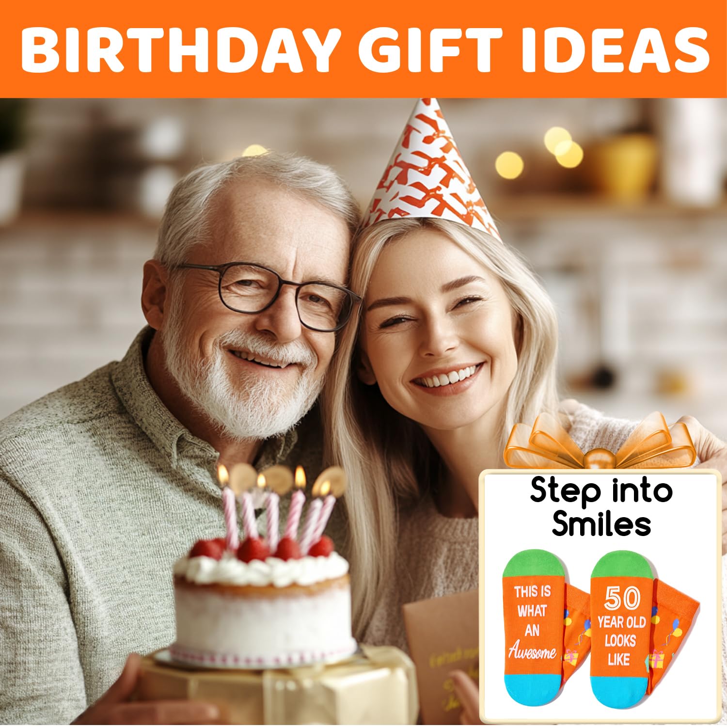 GIFTS for 50 YEAR OLDS: The top of the socks features birthday gifts, hats, cakes, and other elements, the bottom features a hilarious secret message written in non-slip ink: "THIS IS WHAT AN Awesome 50 YEAR OLD LOOKS LIKE."