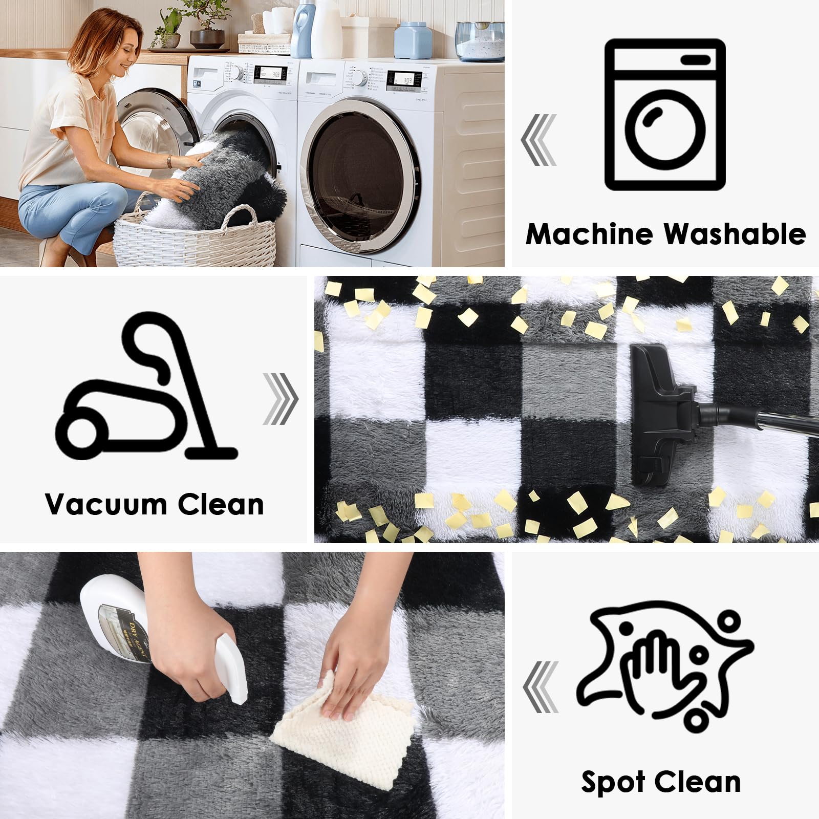 Easy to Clean Plush Area Rug -- Wipe the soft rug with rag or clean it with a low-power vacuum, or shake outside, or hand wash the shag area rug with cold water or mild-cleaner, and place it in a ventilated place to air-dry. Please Note: Do not wash the furry rug by machine, bleach, tumble dry, or iron. Because of vacuum packaging, there will be some creases and not fluffy enough when you first open it, lay it flat for 2 to 3 days and it will be recover fluffy.