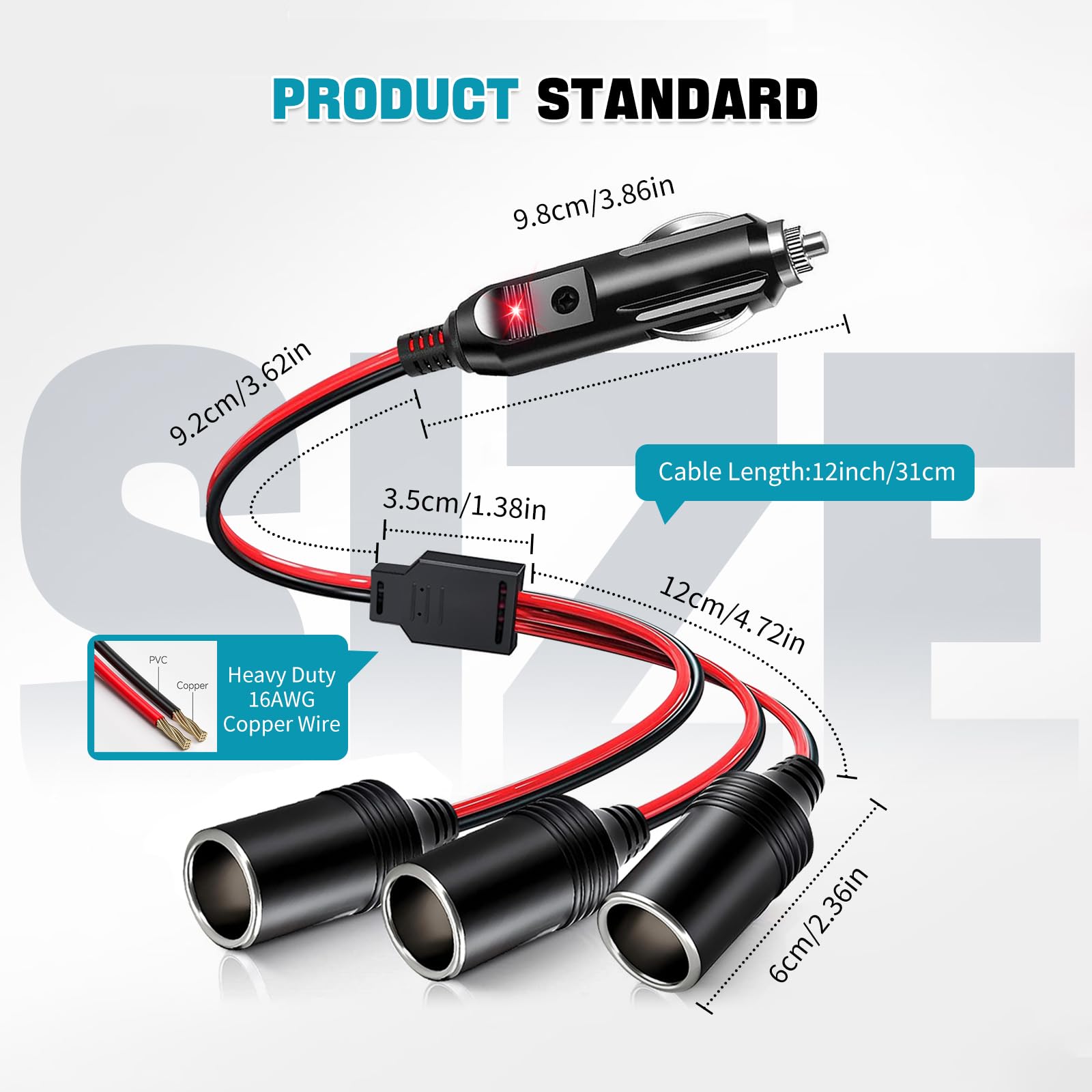 Built in 15A Overload Protection Tube: The male plug is equipped with a replaceable 15A safety fuse to prevent over-current, over-voltage, and short circuit protection, ensuring the normal operation of the cigarette lighter and preventing damage to the car cigarette lighter due to overheating.