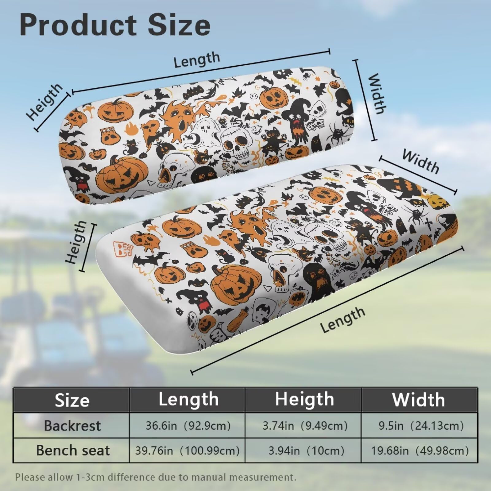Perfect Fit: This 2-piece set includes:Seat Cover: 39.76" L x 19.68" W x 3.94" H; Backrest Cover: 36.6" L x 9.5" W x 3.74" H. Designed to fit most standard golf carts, these Golf Cart Seat Covers provide full coverage for both the seat and backrest, ensuring a sleek, custom look