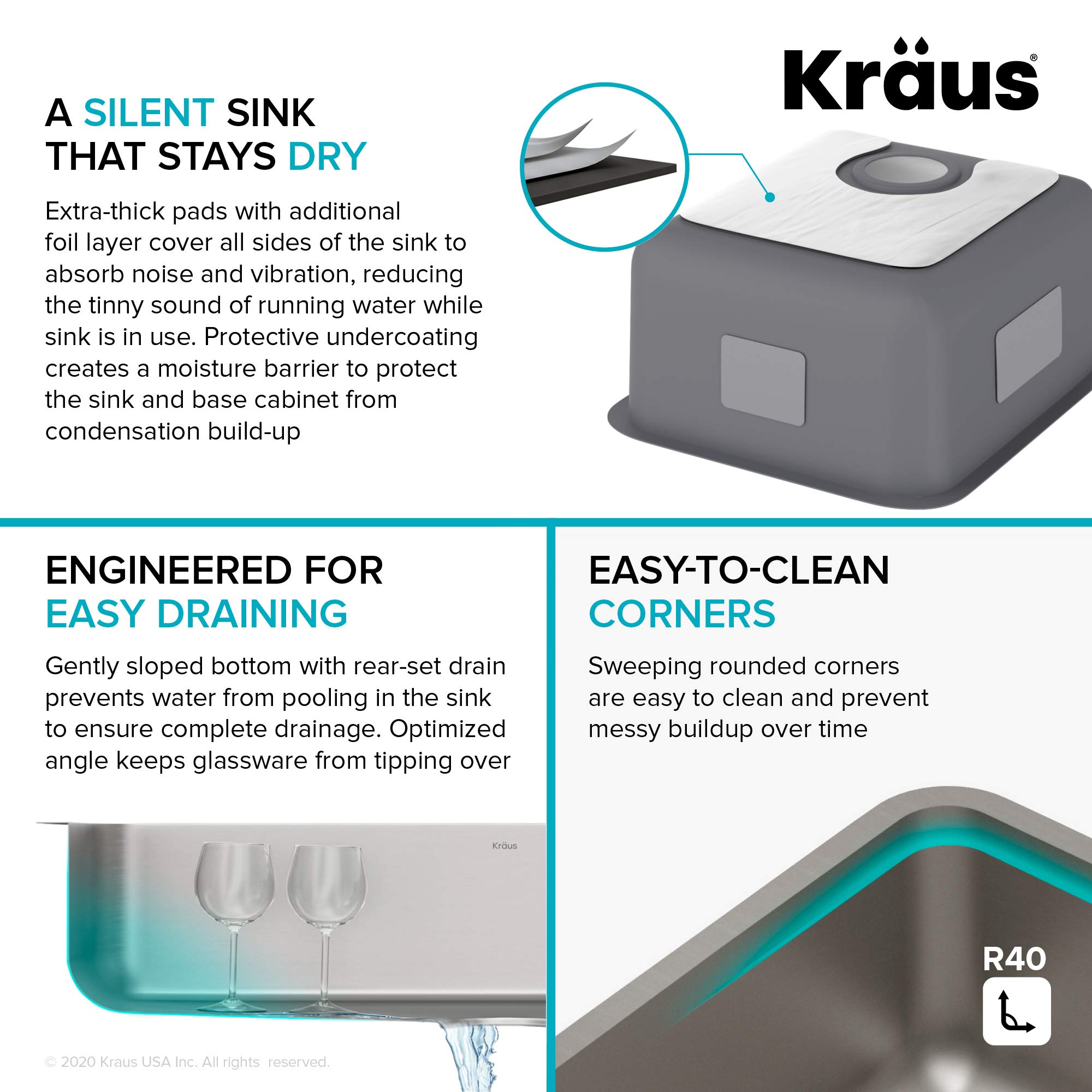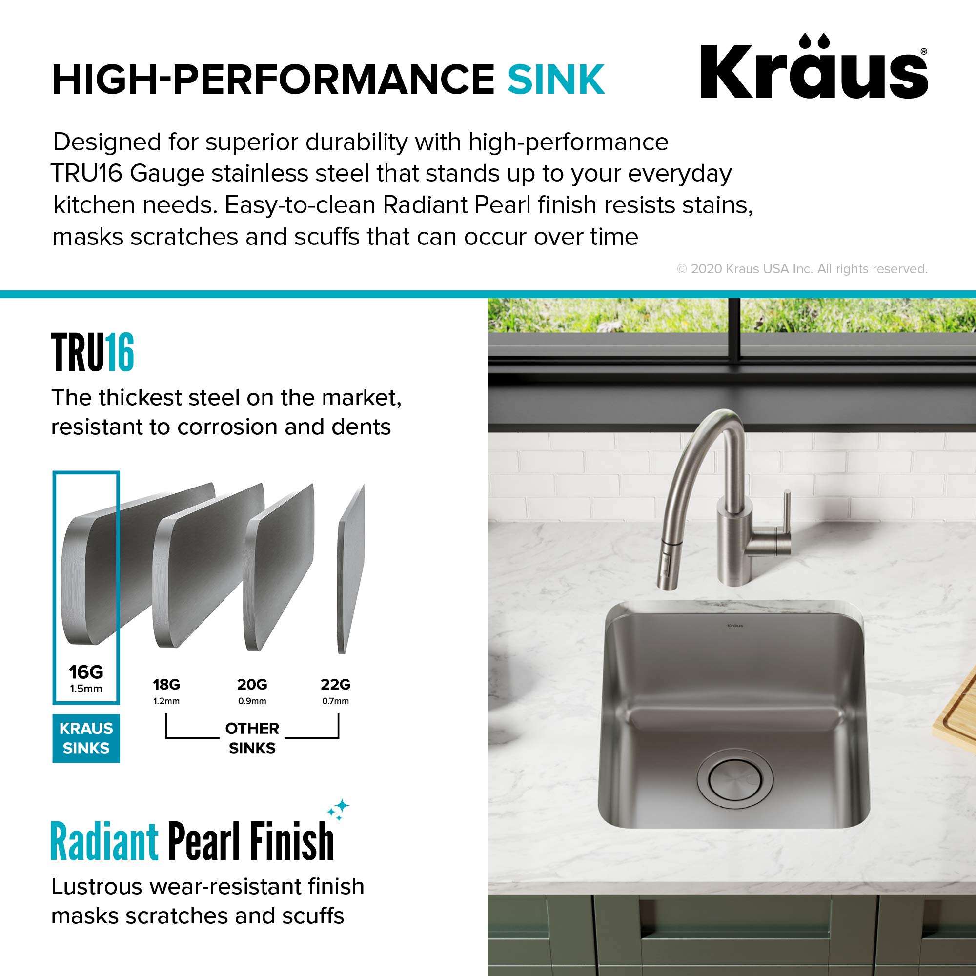 HEAVY-DUTY CONSTRUCTION with high-performance TRU16 Gauge stainless steel that stands up to your everyday kitchen needs – RADIANT PEARL FINISH: Easy-to-clean and wear-resistant, masks scratches and scuffs that can occur over time – SUPERIOR SOUNDPROOFING: Ultra-quiet NoiseDefend pads with innovative foil layer absorb noise and vibration while sink is in use – Anti-condensation undercoating helps prevent moisture build-up to reduce the risk of water damage in the base cabinet