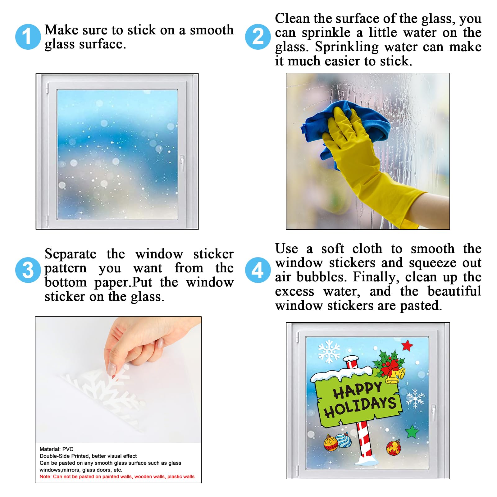 How to Use: Made from quality PVC electrostatic film material. Before use, you can spray some water on the window, so that the window clings can be more firmly attached to the window, easy to peel, leaving no traces when it is torn off, and the window clings can be reused