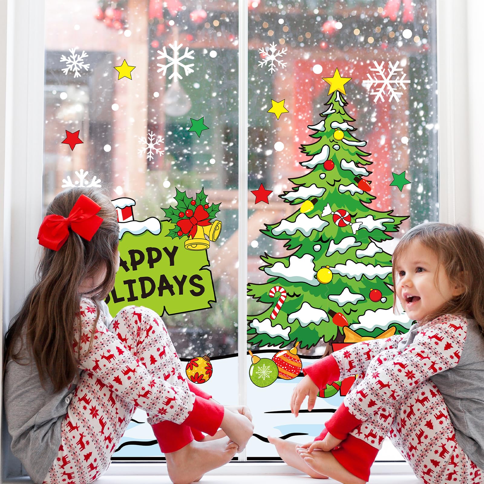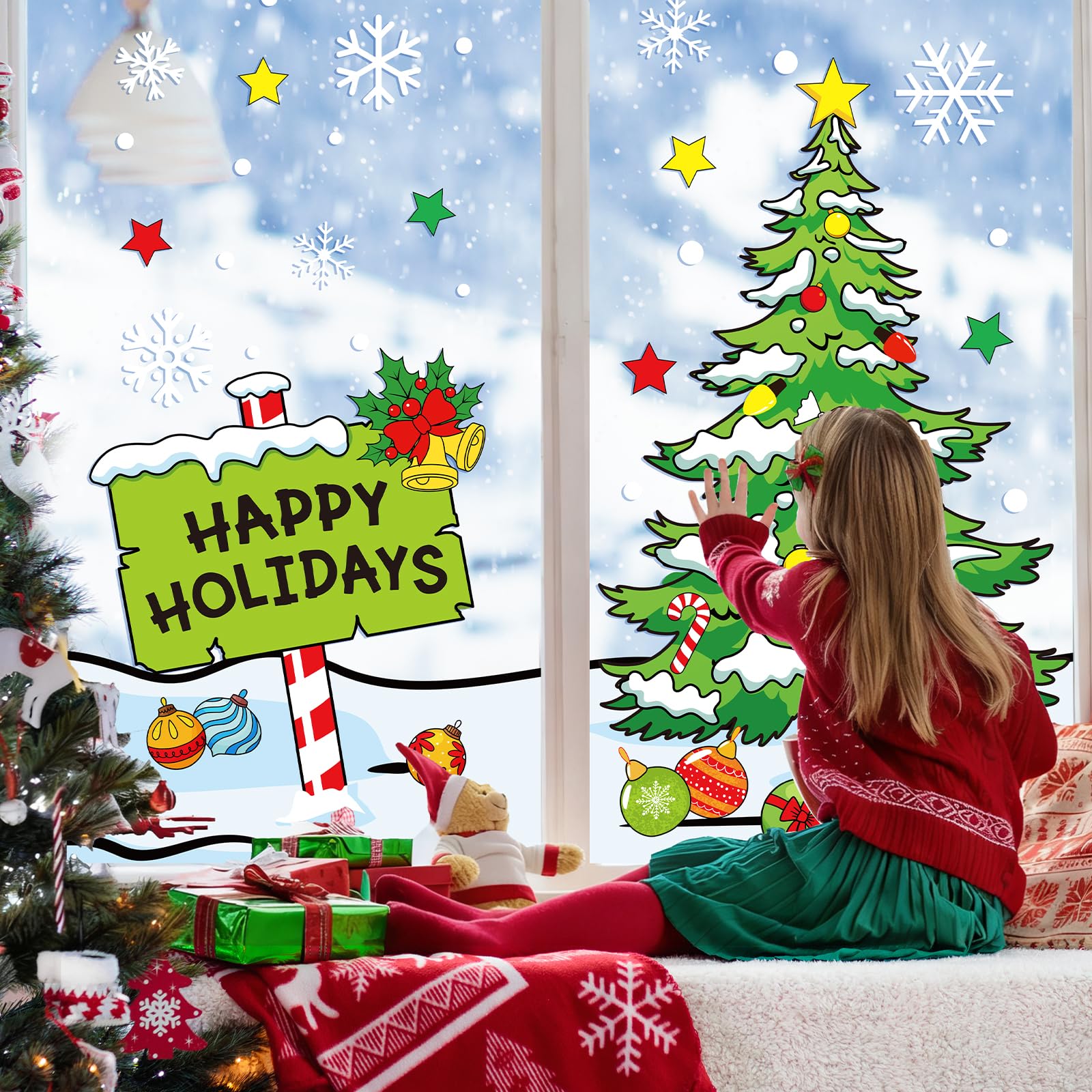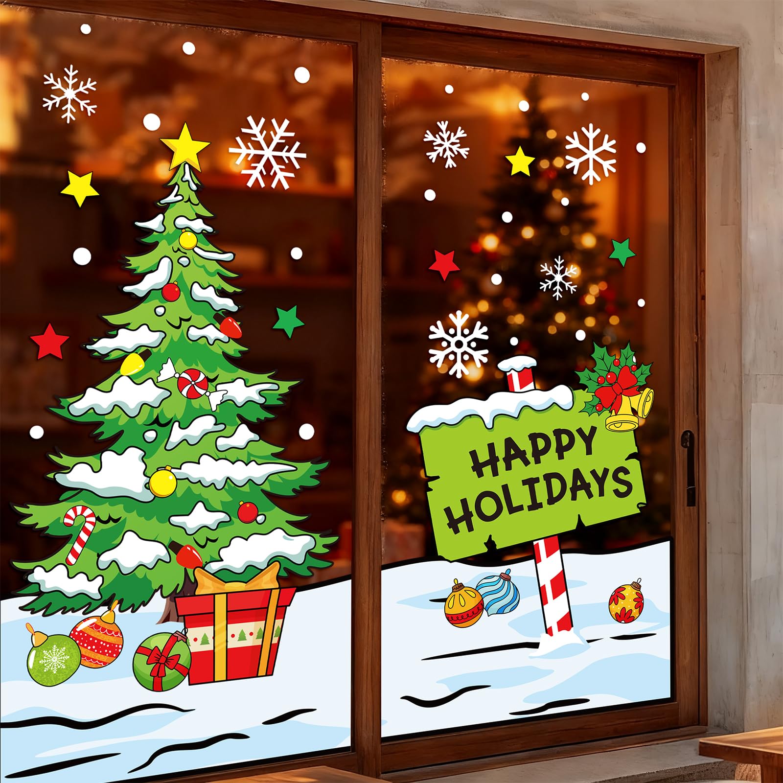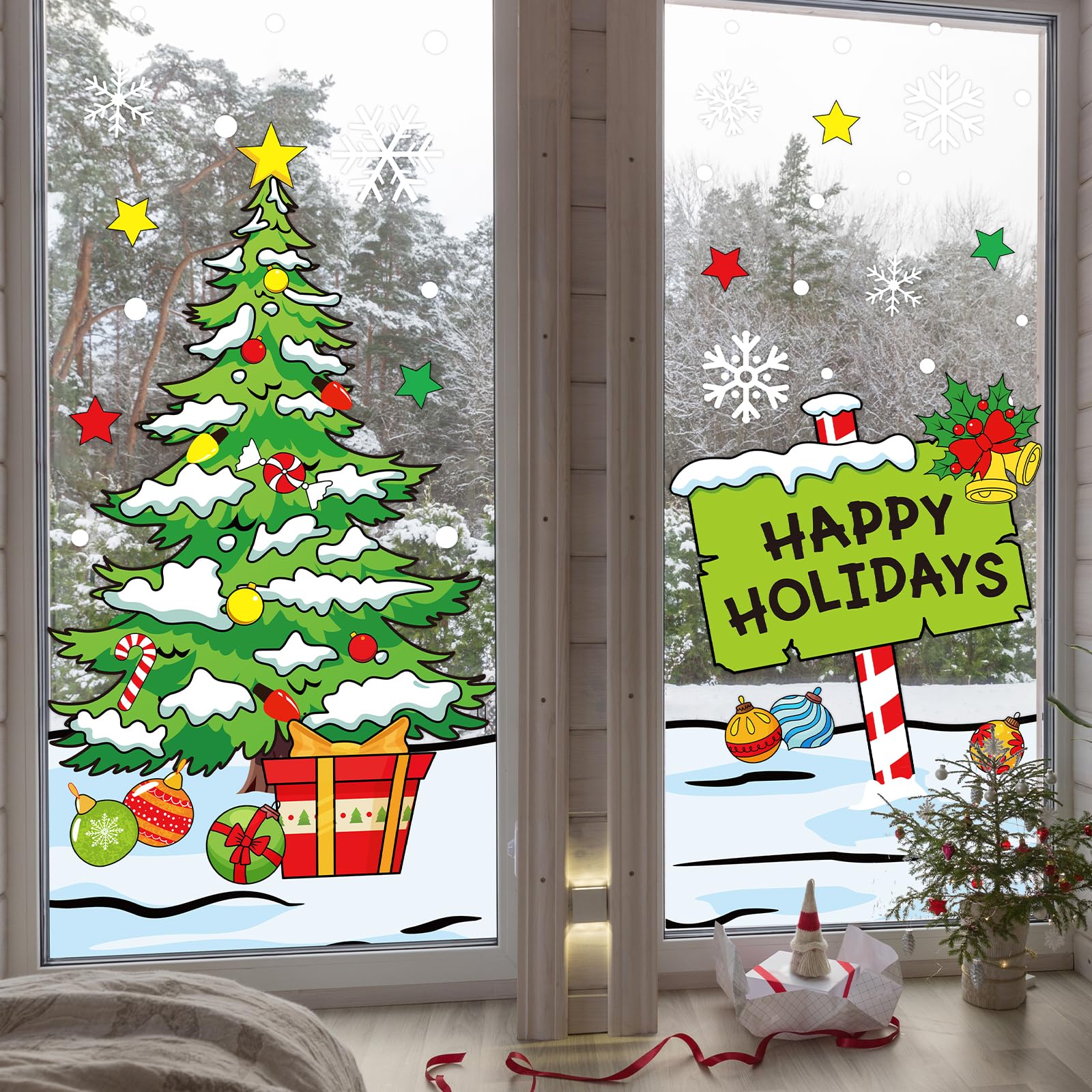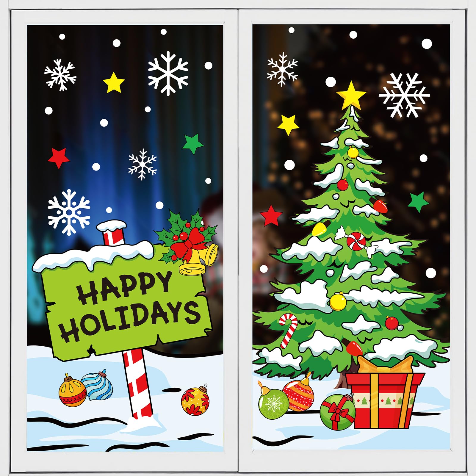 Holiday Design: Features Happy Holiday signpost, Christmas tree, snowflake and other motifs, cartoon lovely and funny, full of festive atmosphere, will be a nice addition to your window decorations