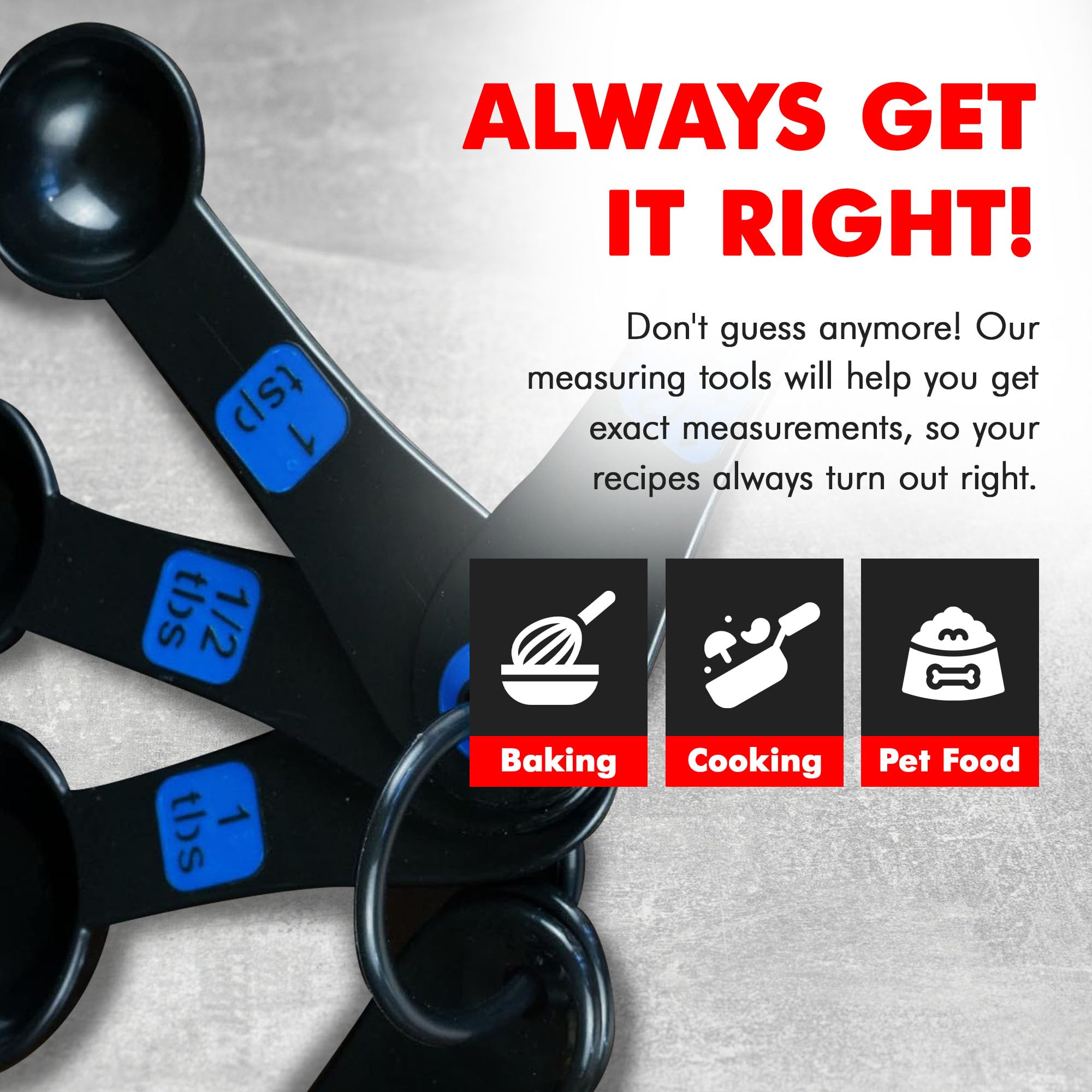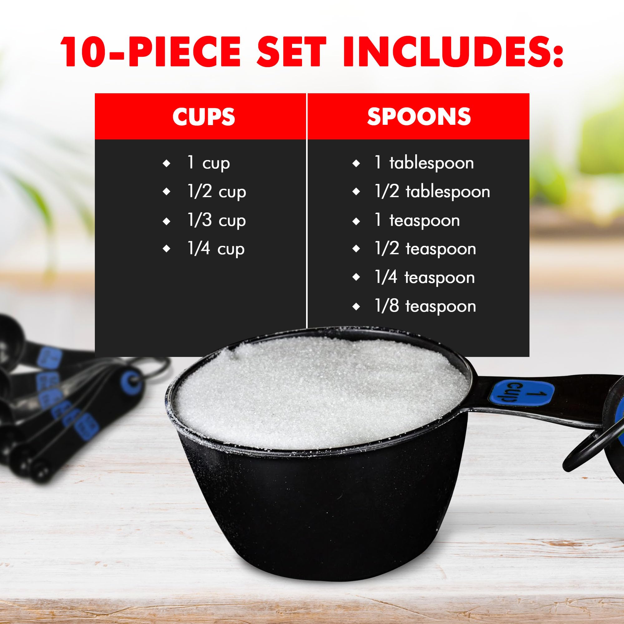 Includes 1/8 tsp, 1/4 tsp, 1/2 tsp, 1 tsp, 1/2 tbsp, 1 tbsp, 1/4 cup, 1/3 cup, 1/2 cup and 1 cup sizes
