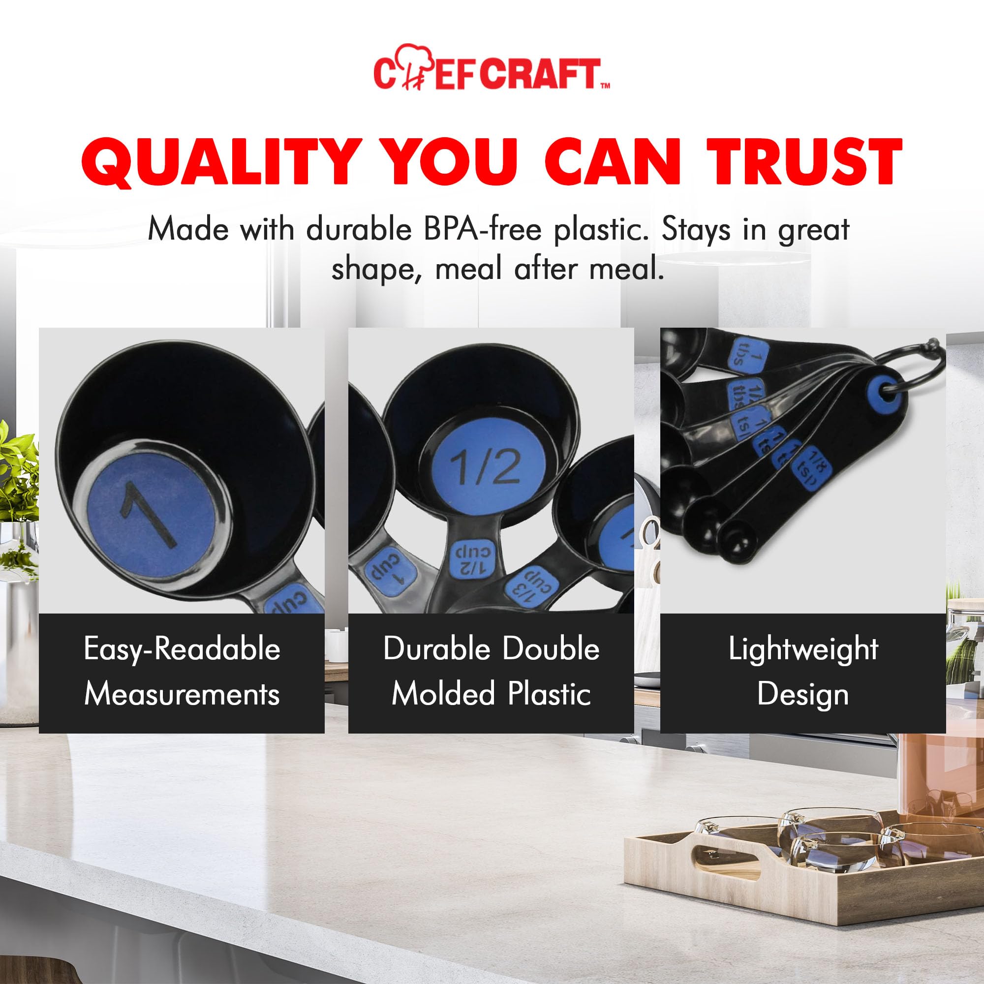 This set of Chef Craft Measuring Cups and Spoons is not only bright, but also affordable. The numbers are double molded, so the numbers are very durable and will not rub off. The color-contrasting numbers are large print and easy to read for everyone. They are made out of a durable plastic, making them lightweight and dishwasher safe. Includes 1/8 tsp, 1/4 tsp, 1/2 tsp, 1 tsp, 1/2 tbsp, 1 tbsp, 1/4 cup, 1/3 cup, 1/2 cup and 1 cup sizes.