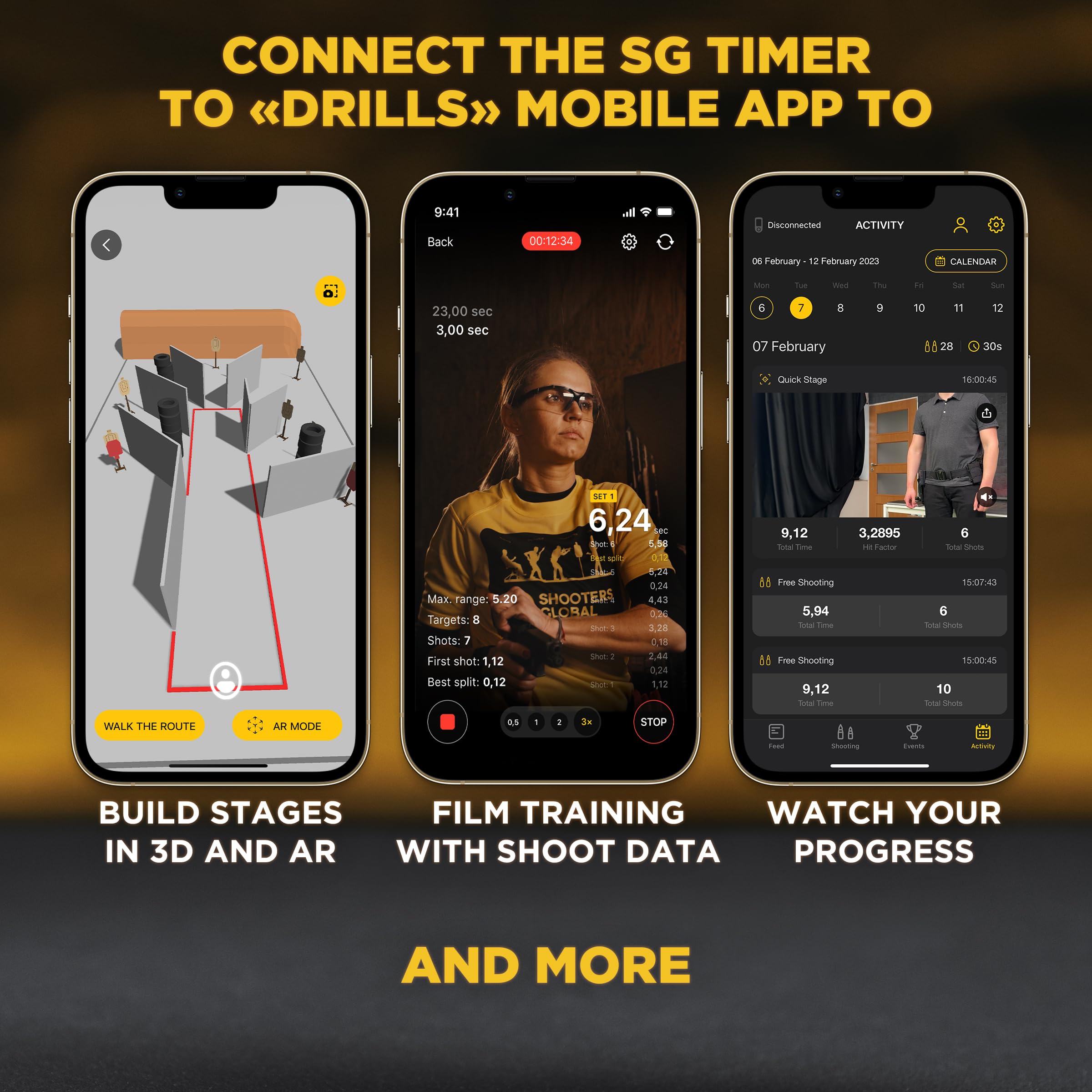 BLUETOOTH AND COMPANION APP – “Drills” is a tailor made app for SG Timer. It allows you to capture training videos with shot timer from the timer overlaid on a video in real time, control the timer remotely, analyze your performance on a large screen, create and share stages in 3D and AR and more.