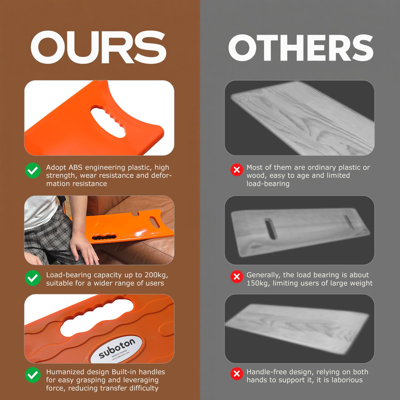【Anti-slip design】 With an anti-slip design on the back, the transfer board is placed more securely, increasing safety during use and preventing patients from falling and being injured.