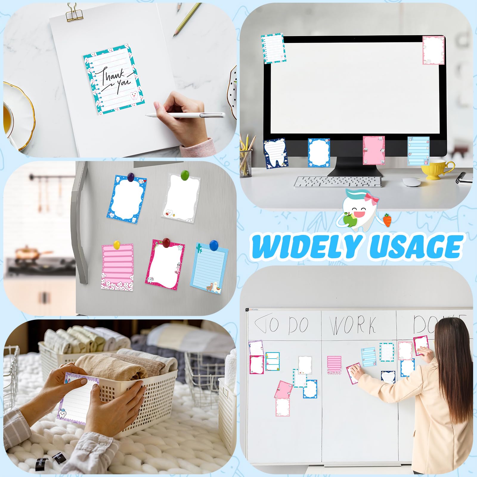 Adhesiveness and Detachability: with good adhesion, these self adhesive tooth sticky memo notes can be easily pasted on smooth and dry surfaces, such as textbooks, notebooks, refrigerators, blackboards, walls, windows, doors, bulletin boards, etc., and can be easily removed without leaving stains