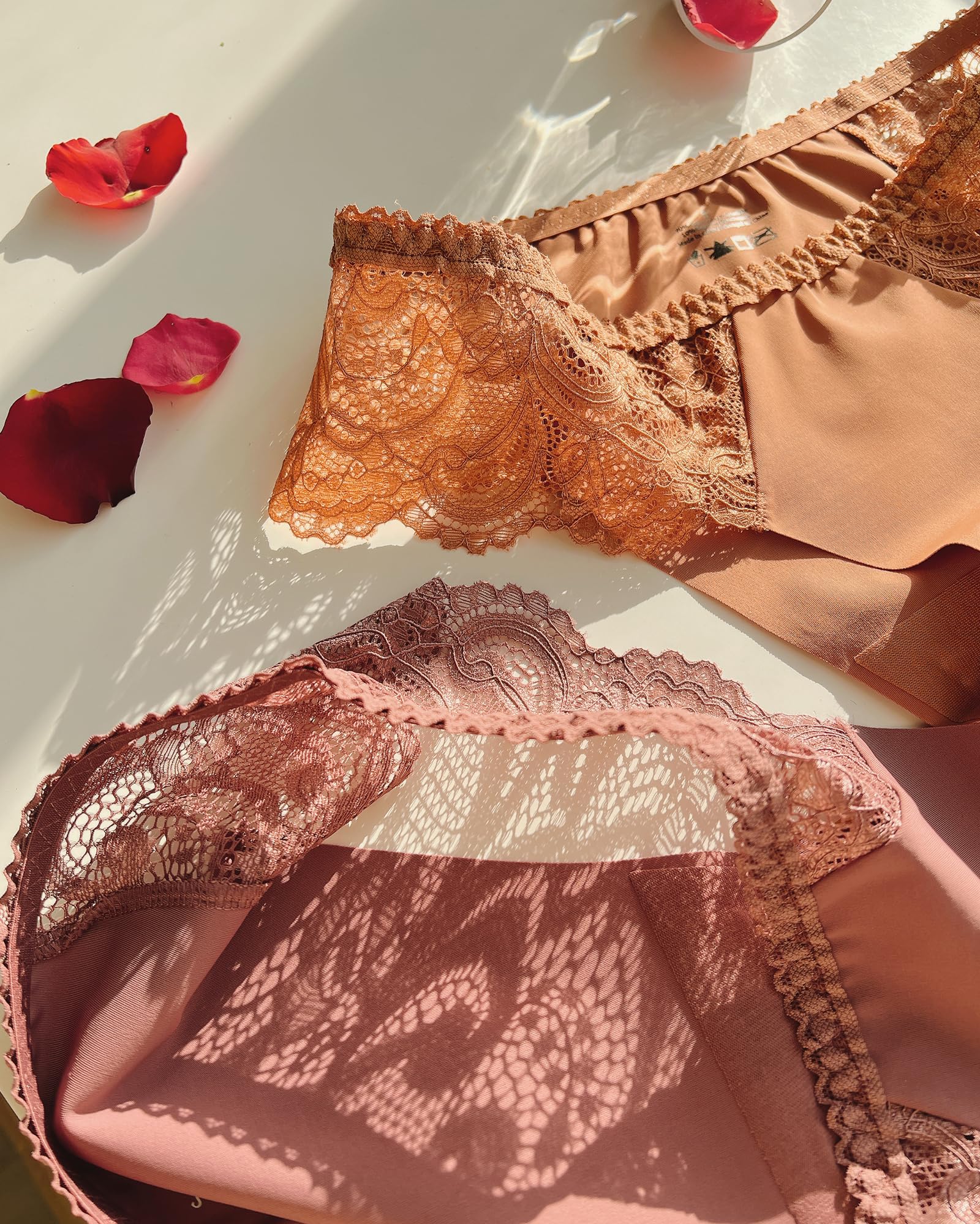 PRODUCT DESCRIPTION: The lace on the sides provides a subtle shine, adding elegance and sexiness. The elastic waistband is covered in matte lace for extra comfort, while the front and back panels are made from silky, buttery-soft,stretchy fabric, offering a smooth, no-show fit. The low-rise, high-cut seamless cheeky cut creates a flattering silhouette without digging into the skin, the ROSYCORAL underwear pack perfectly balancing style and comfort.