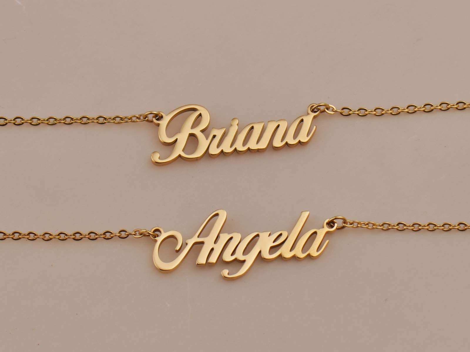 Name Necklace Personalized made of stainless steel with 18k Gold color, nickel free. We Suggest Keep it dry and avoid wearing it when bathing or swimming
