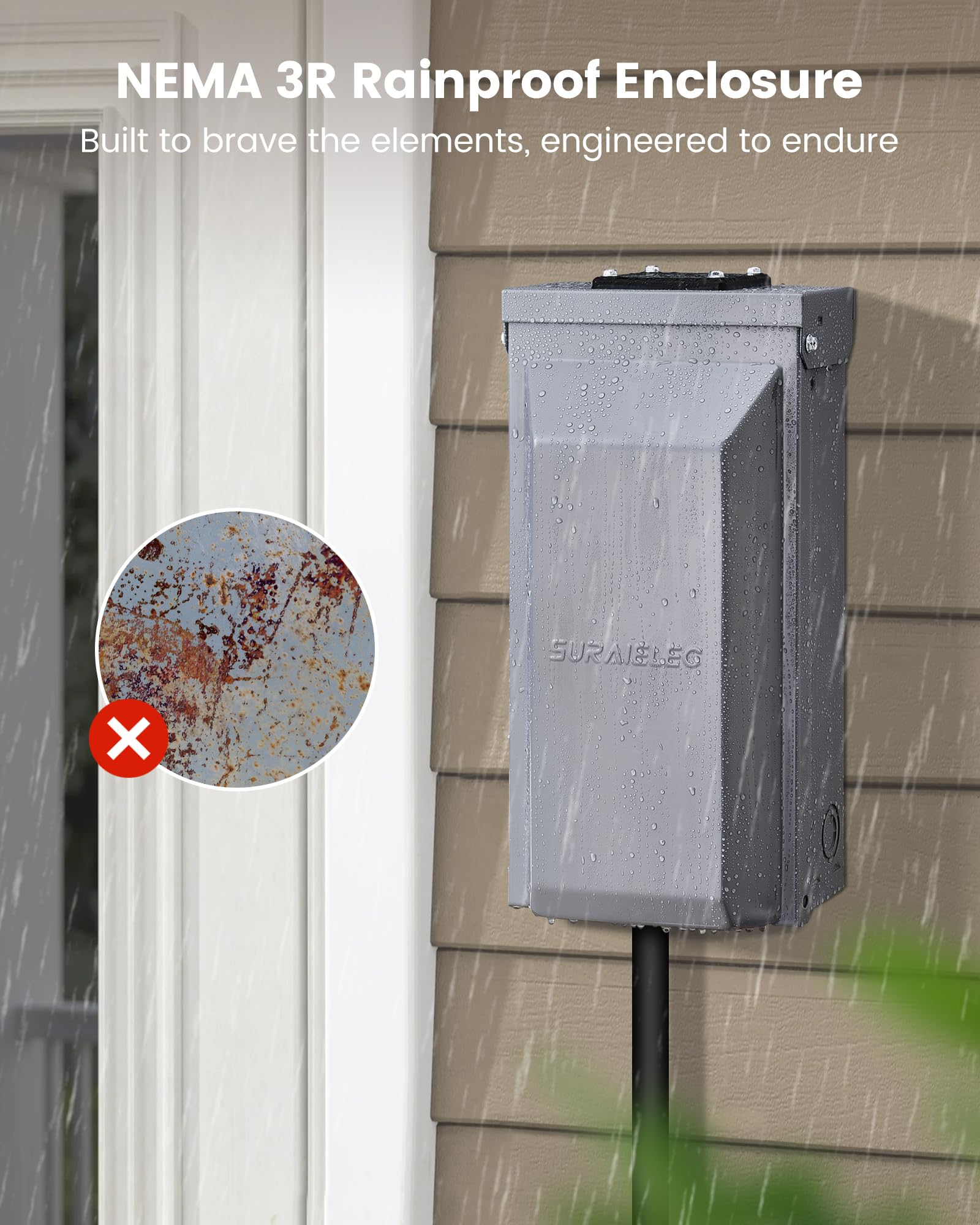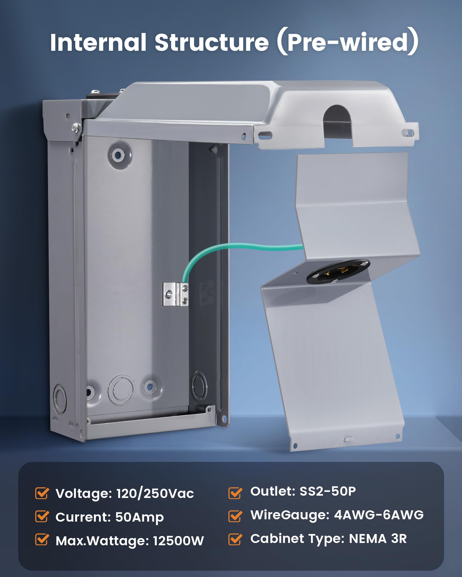 Generator Power Inlet Box: Our power inlet box features a NEMA SS2-50P plug, rated for 12,000W and compatible with 4-6 AWG wire. The 3R rainproof design and ETL Certified receptacle provide enhanced safety and reliable outdoor performance