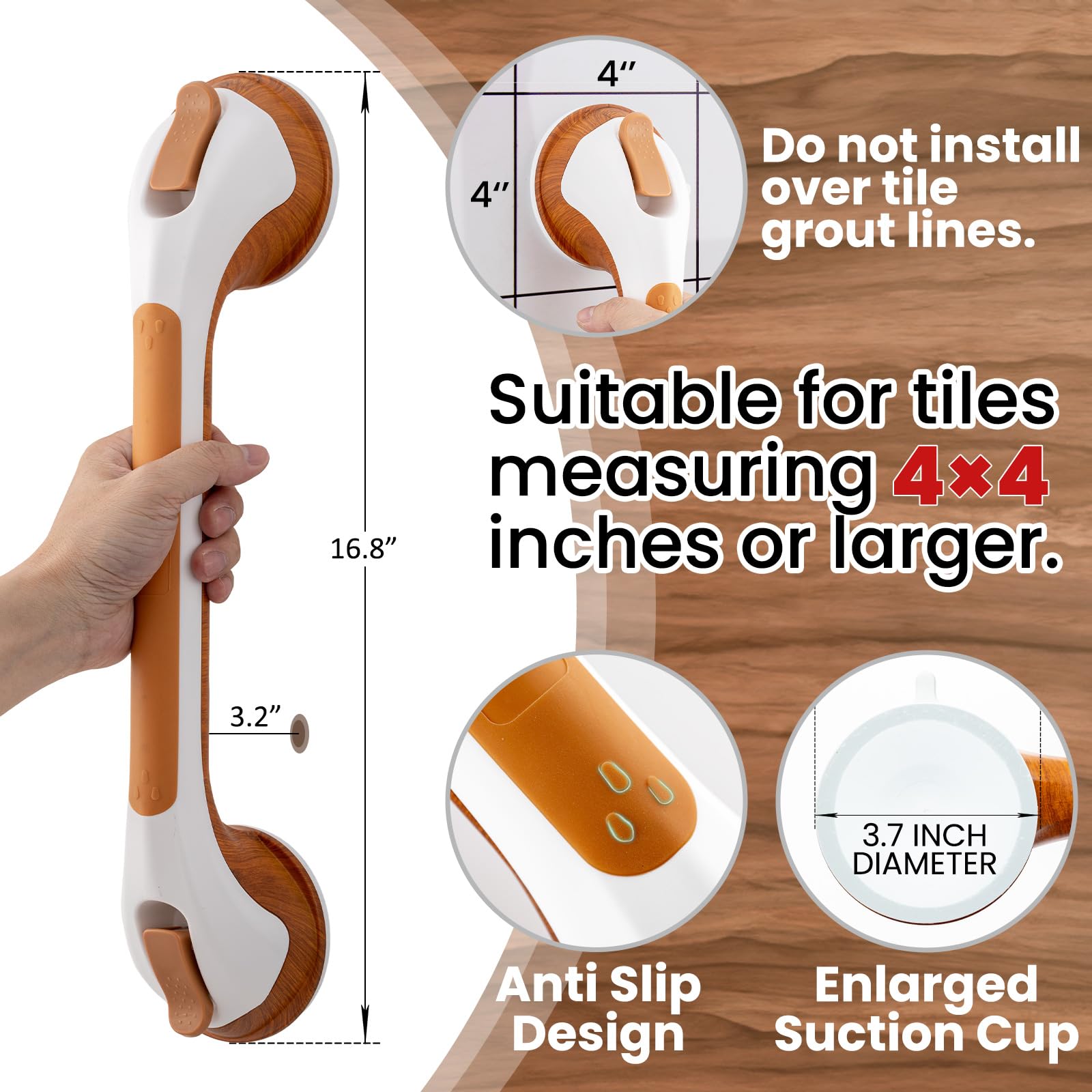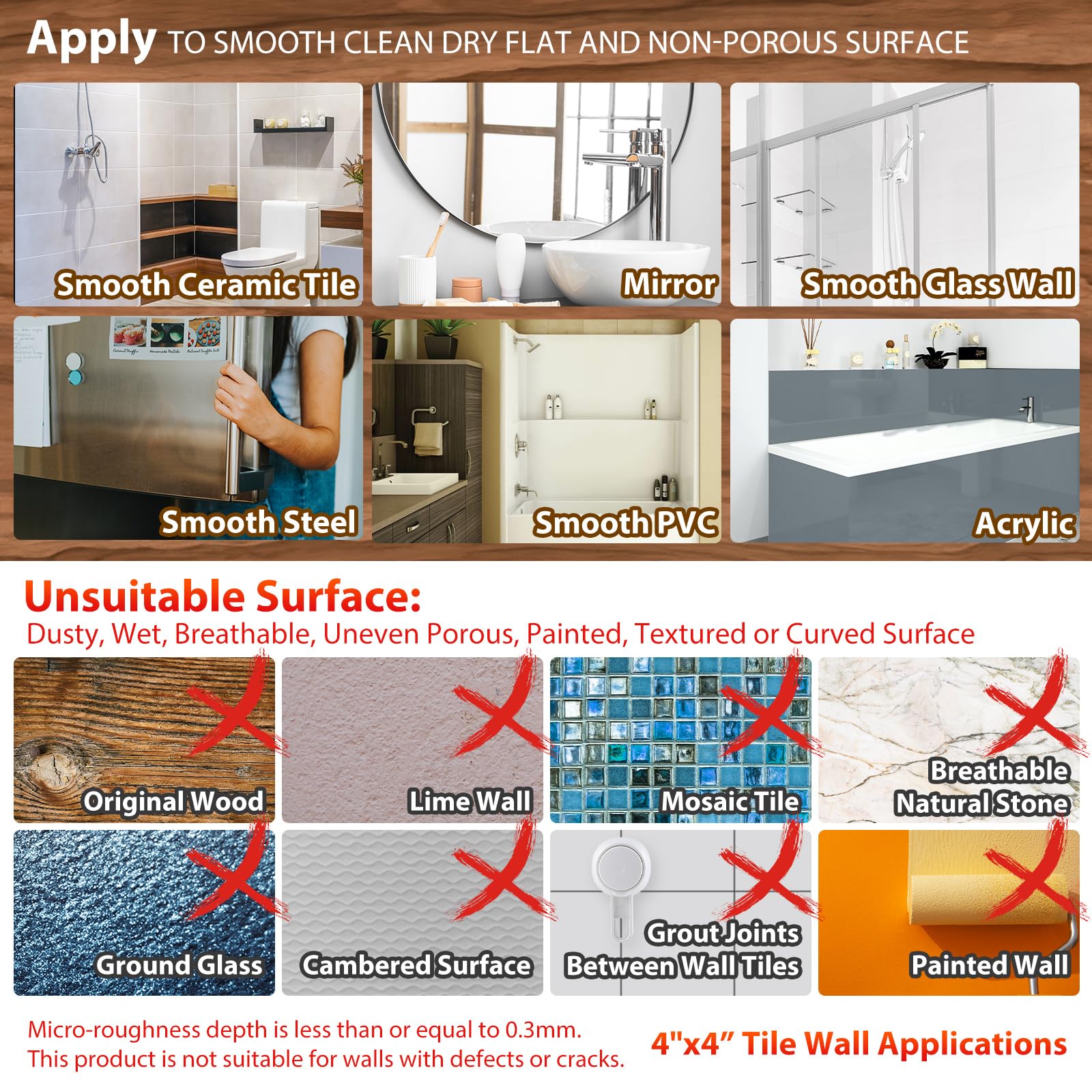 Matters need Attention: Only suitable for tiles measuring 4×4 inches or larger. For the safety of the seniors and elderly, please pay attention that the suction grab bars for shower ONLY sticks on smooth and non-porous AIRTIGHT walls which are NOT air-permeable like metal, glass, tile, marble, stainless steel and acrylic but does NOT apply on uneven tile, unfinished marble, wallpaper, dry wall, porous wall, painted wall,etc. Please don't put all the body on the shower grip