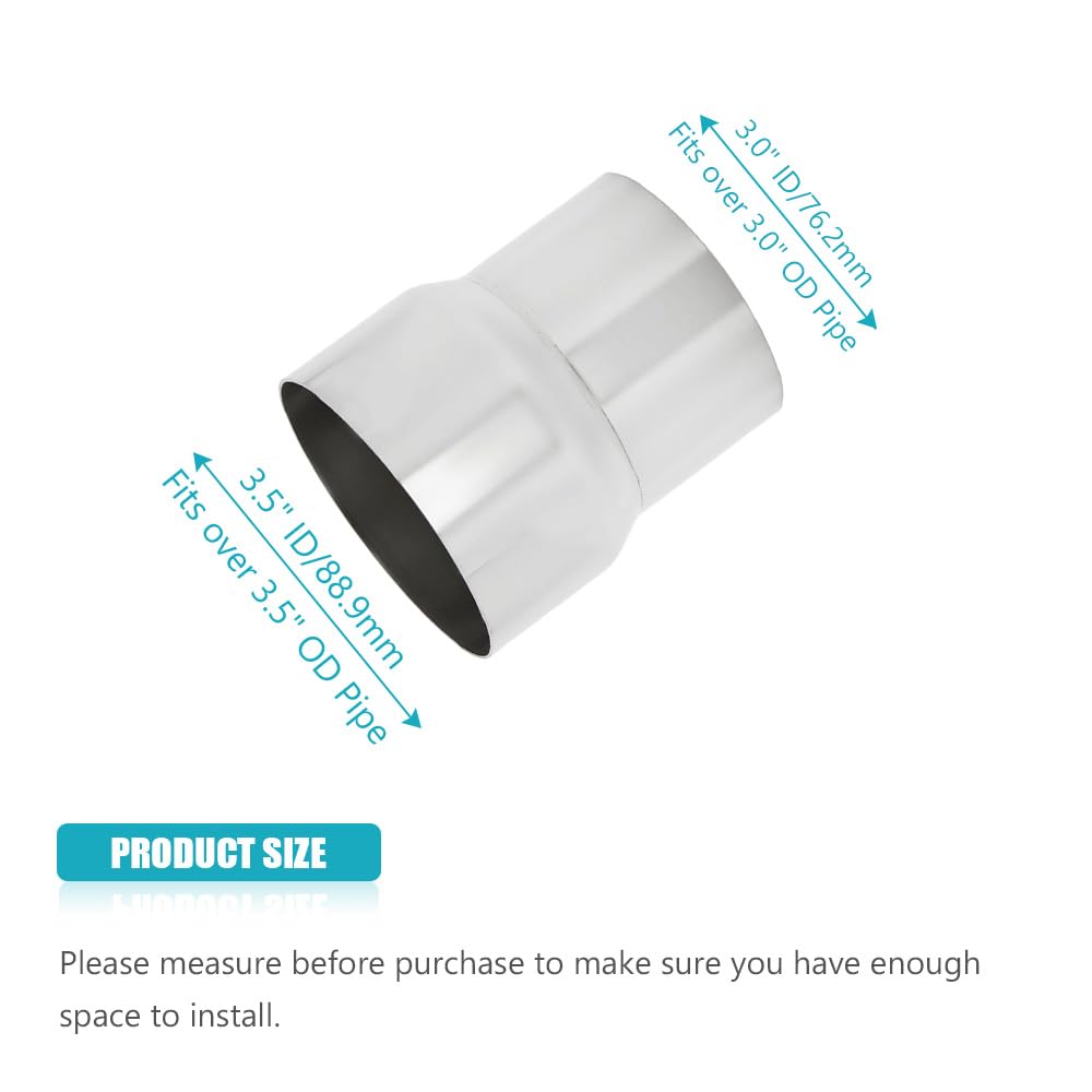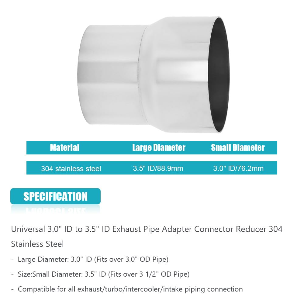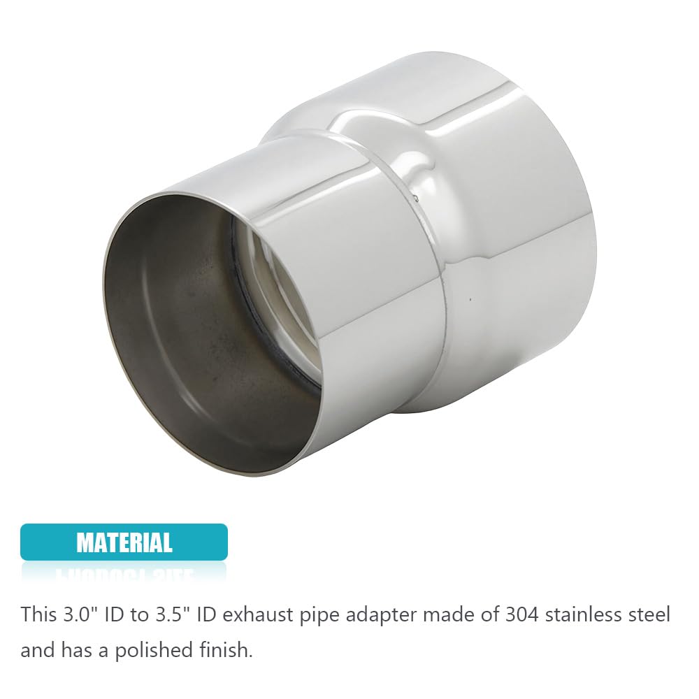 【High Quality】This 3.0 Inch to 3.5 Inch (3” ID to 3 1/2” ID) exhaust pipe adapter made of 304 stainless steel and has a polished finish.