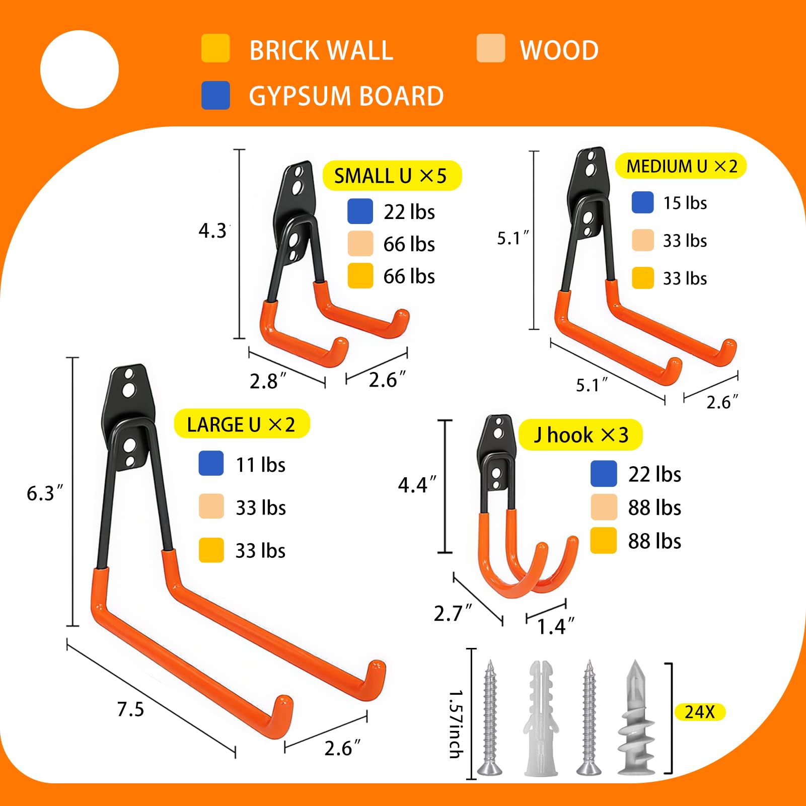 Multi-Size Options for Flexibility: This utility hooks set includes 12 heavy-duty hooks in four practical sizes: 5 small U-hooks, 2 medium U-hooks, 2 large U-hooks, and 3 small J-hooks. Mix and match to meet your specific storage needs and maximize organization.