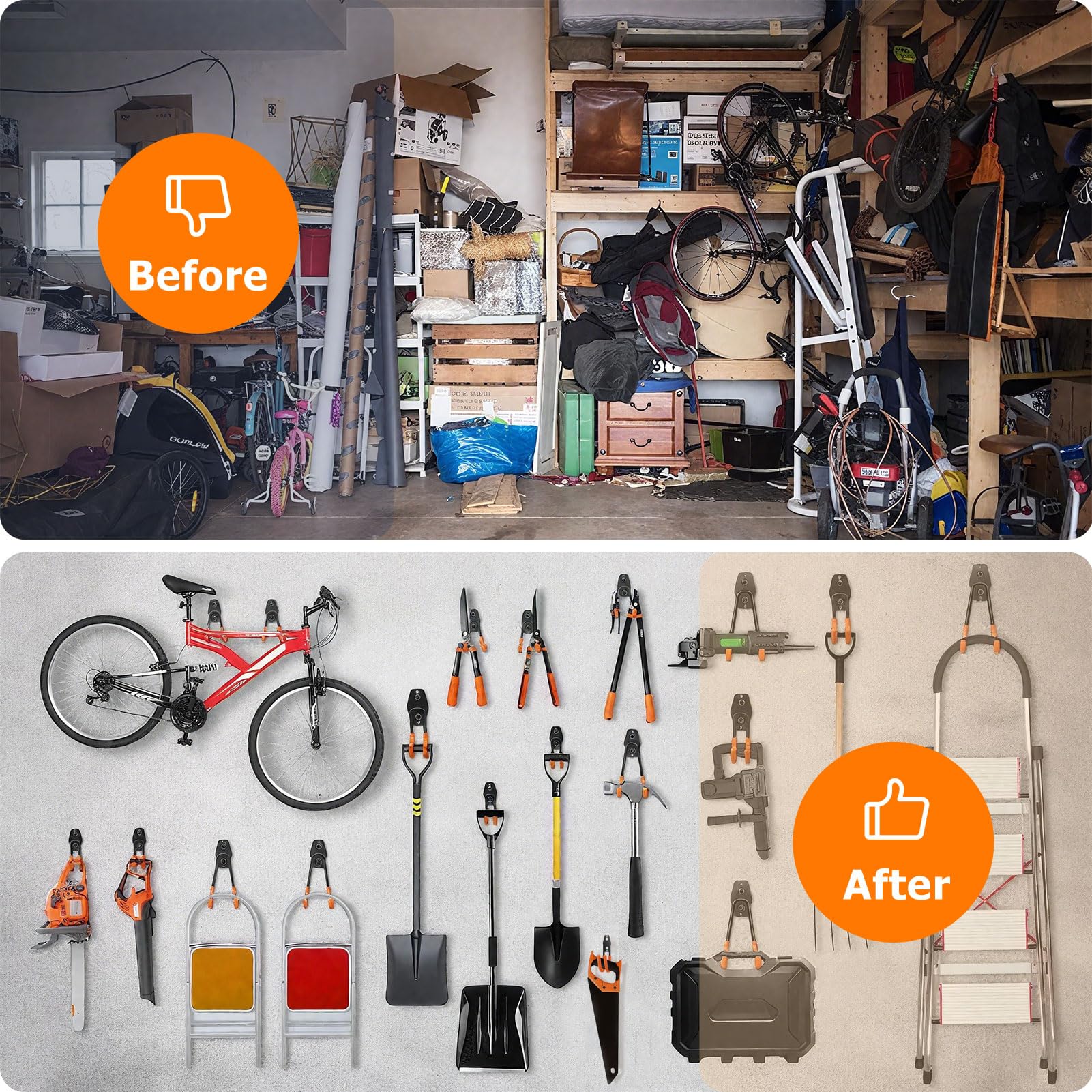 Space-Saving Double-Hook Design: Engineered to maximize vertical space, these dual-purpose garage storage hooks help declutter your area while keeping essentials neatly accessible. Perfect for use in garages, workshops, gardens, basements, and more—everything stays organized and visible at a glance.