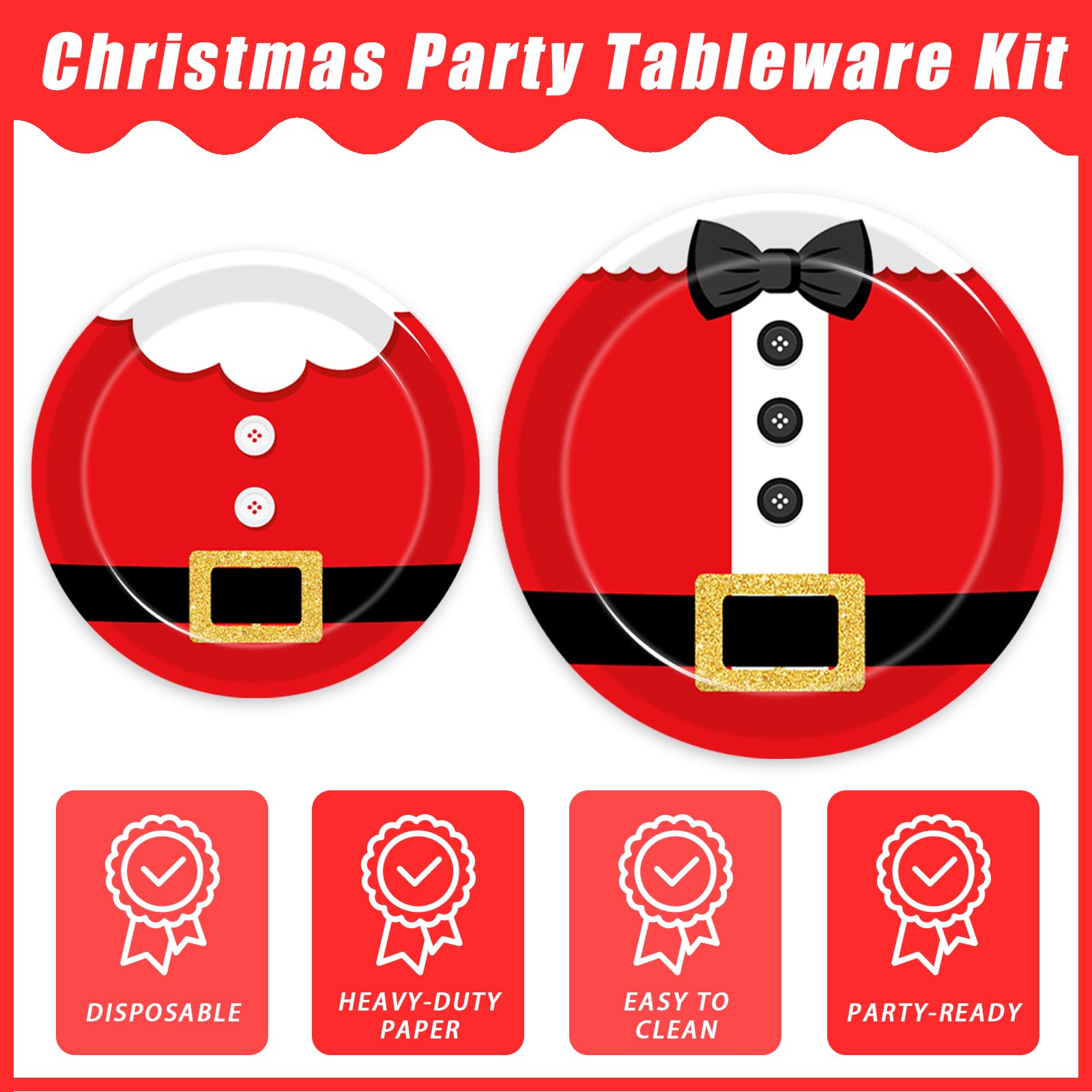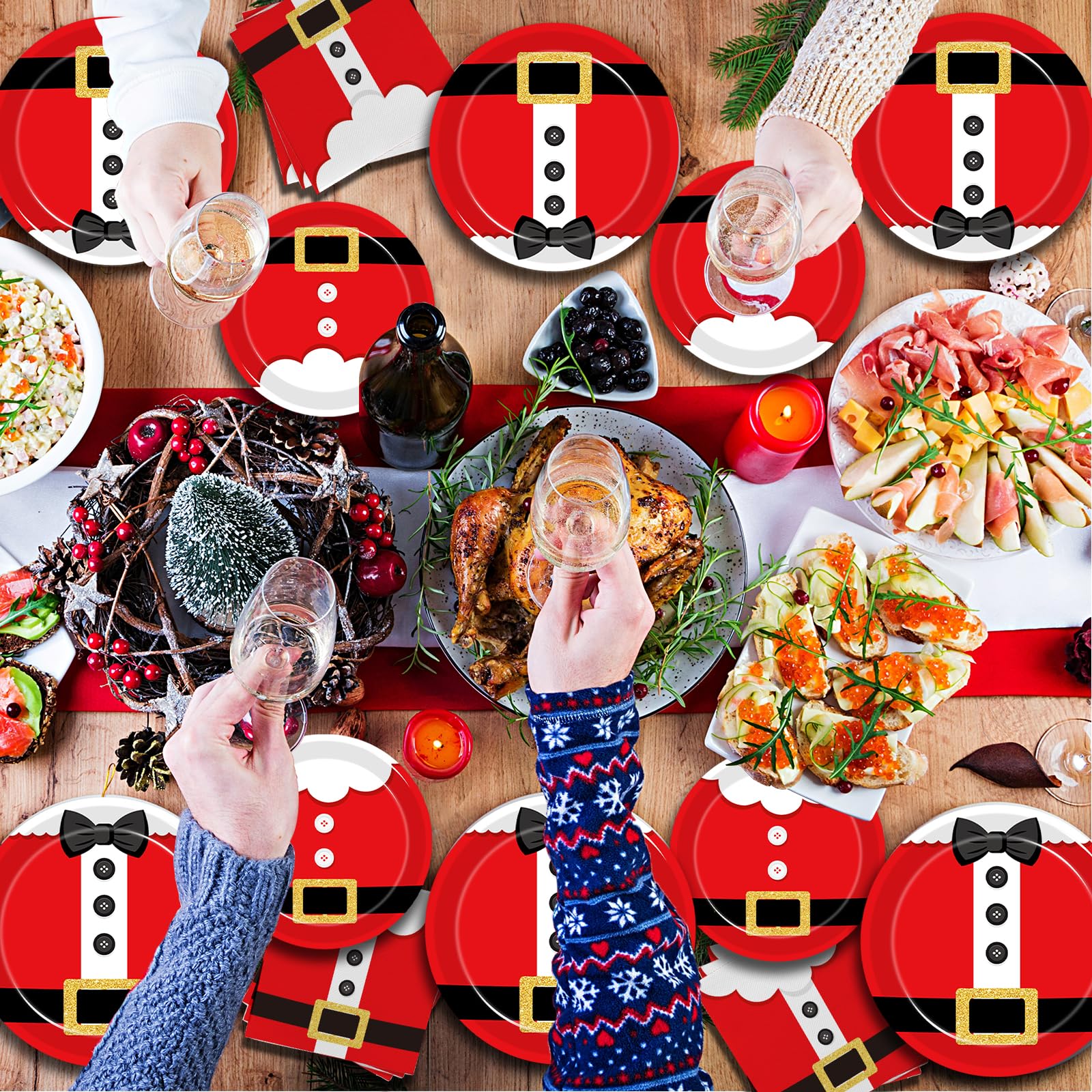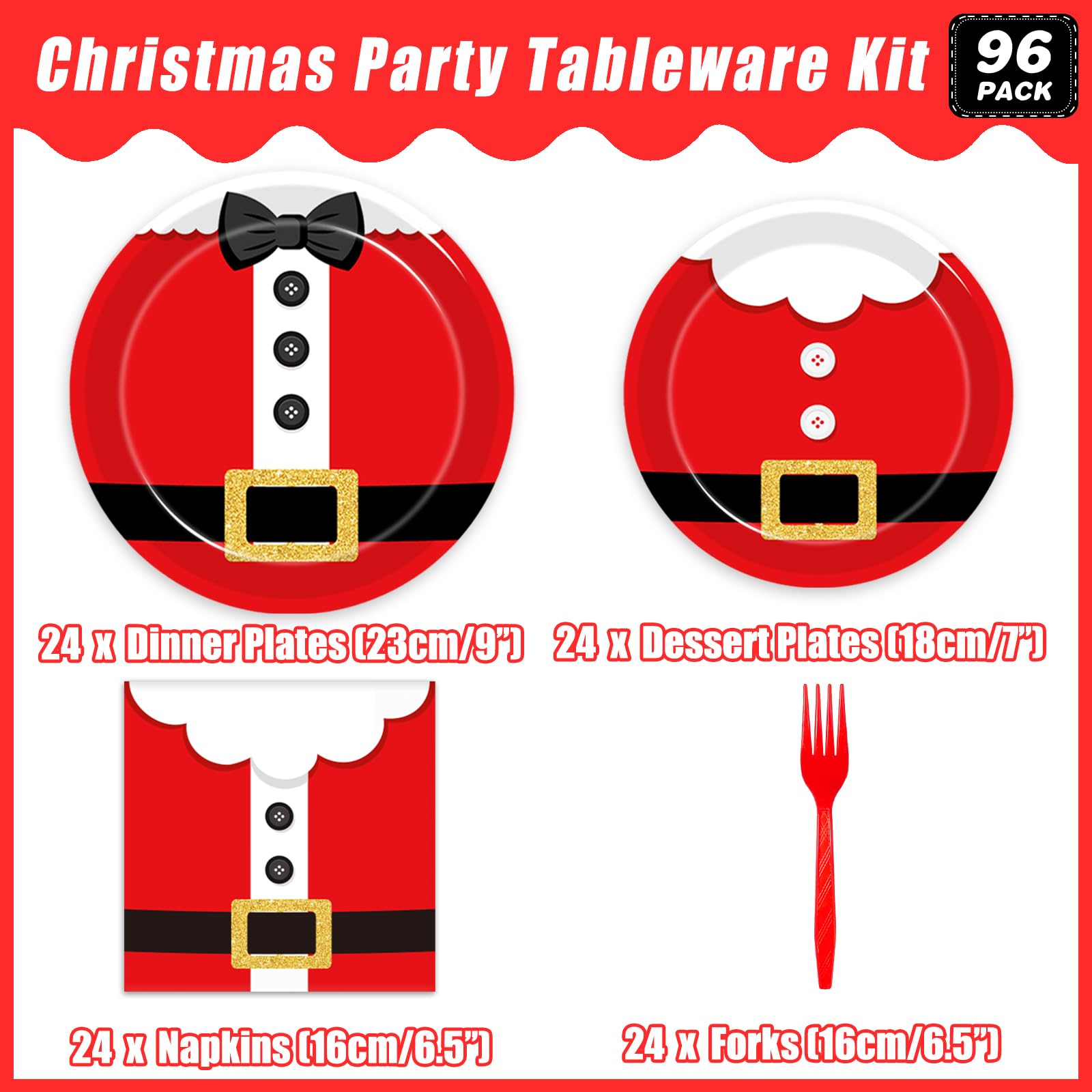 CHRISTMAS PARTY: For each Christmas Santa clause suit print party supplies set, you will receive 24 dinner plates (9’’), 24 dessert plates (7’’), 24 napkins (13’’), and 24 forks(6.5’’). The Santa Claus party supplies set are perfect gifts and the perfect complement to your merry Christmas party decorations