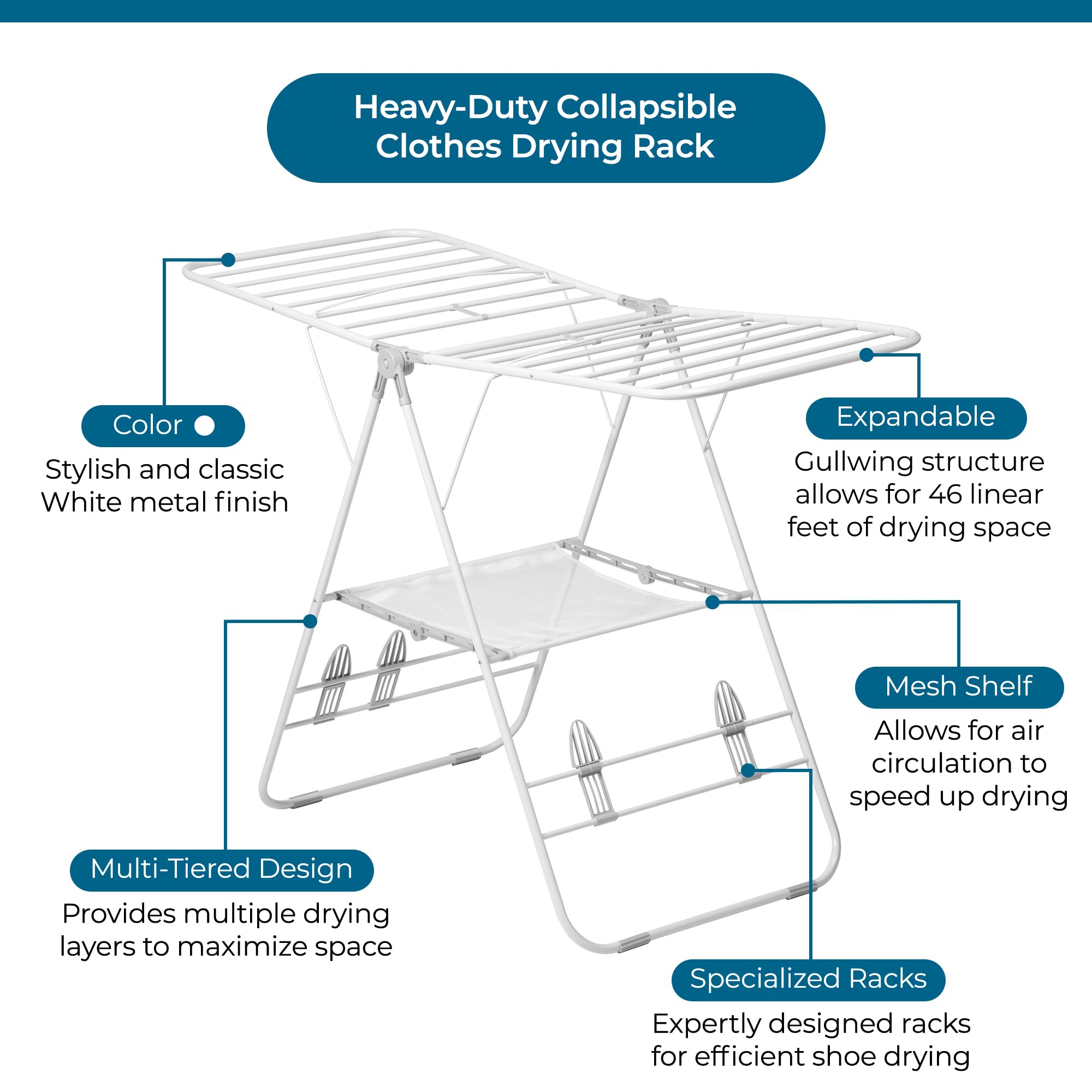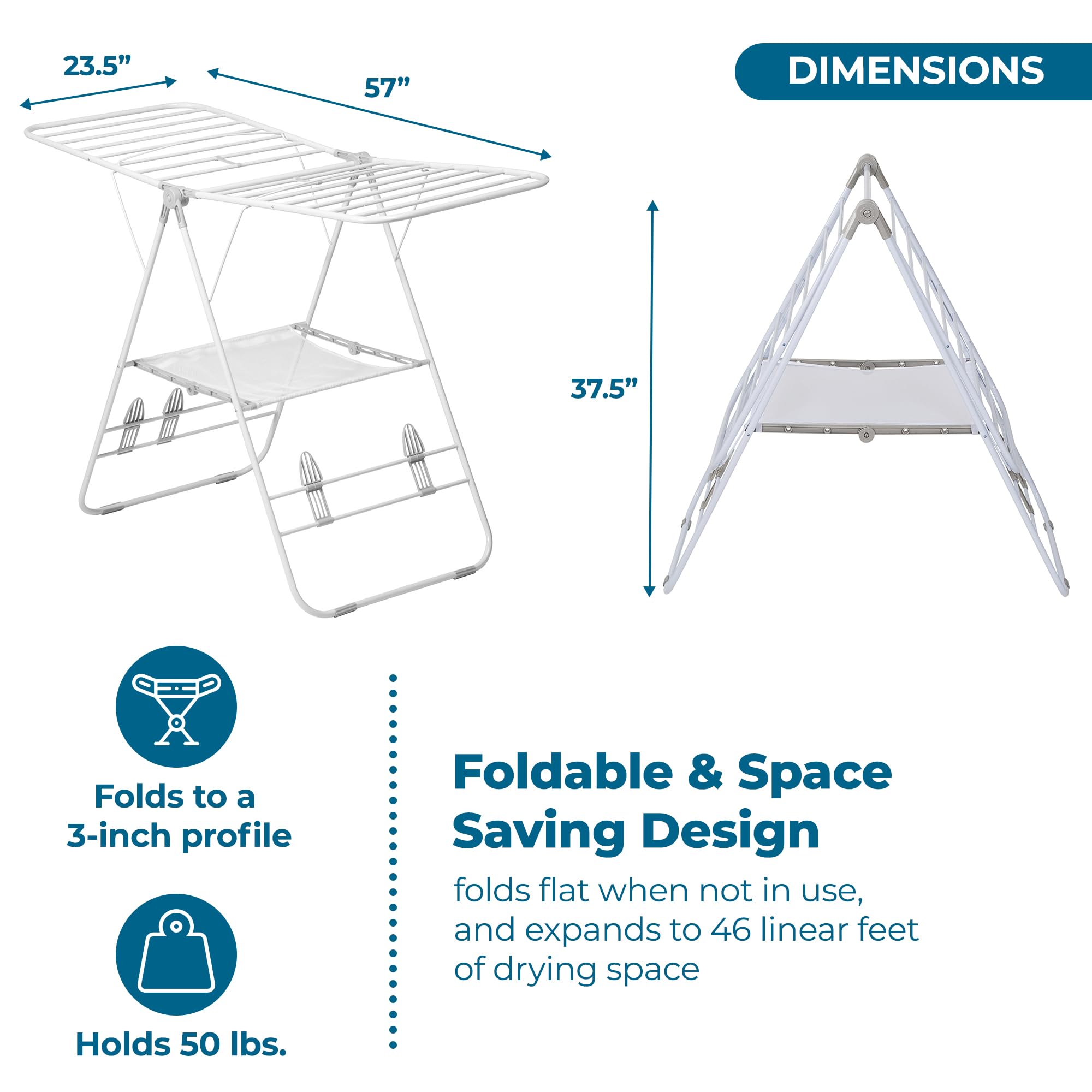 Expandable Gullwing Structure – This 46 linear Feet foldable drying rack provides ample hanging space, making it a practical alternative to electric dryers while folding down when not in use