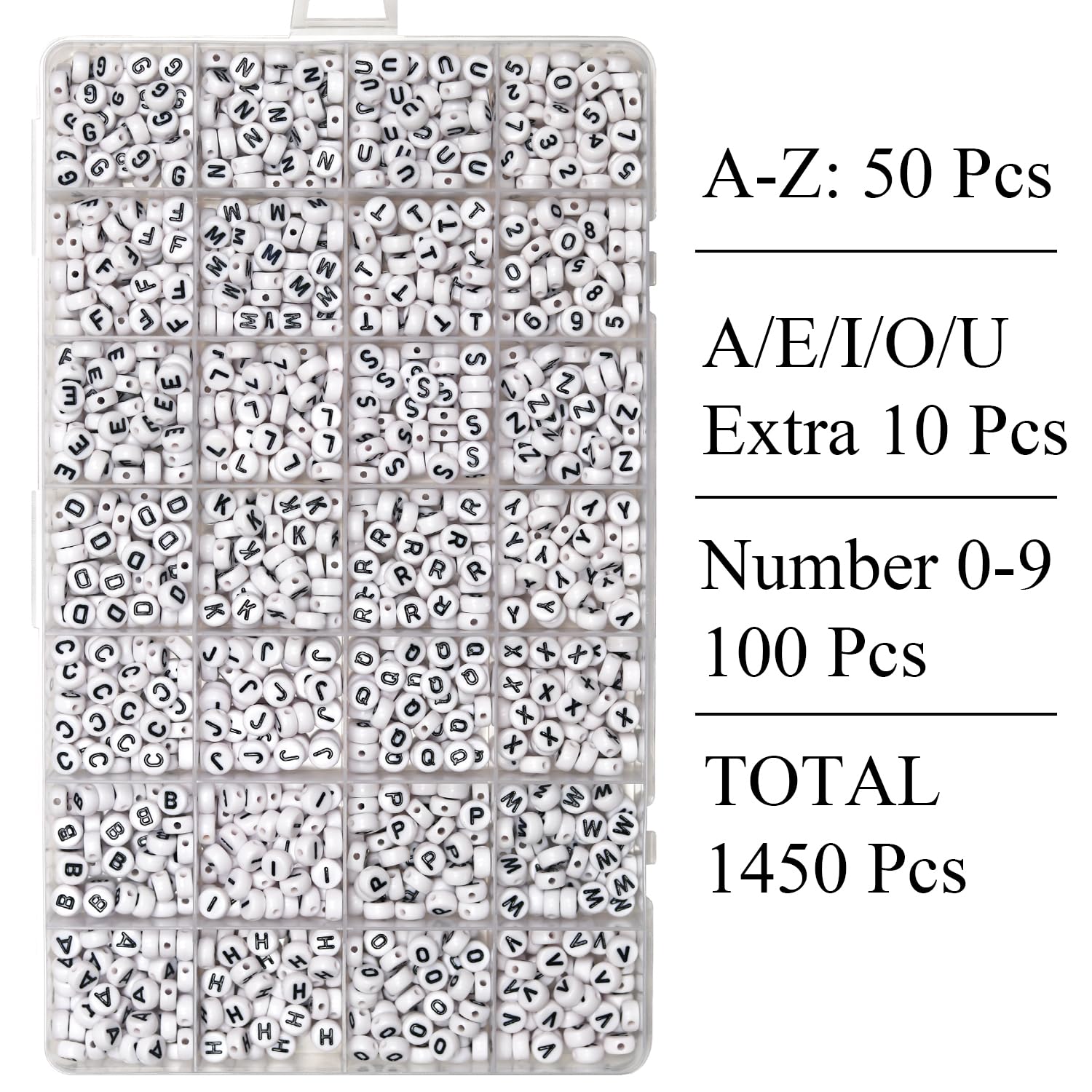 Our advantage: Excellent quality alphabet beads and Number beads Strictly arranged in order In the storage box, the quantity is accurate, therefore making crafts easier. - A to Z letters: 50 each - A/E/I/O/U/T: Extra 10 each -0-9 Number: Random number beads, total of 100 -There are a total of 1450 beads in the box. High Quality: Our acrylic beads are made by advanced technology, with bright and shiny surface, bright letter colors, clean bead edges and holes, not easy to fade. perfect size to make beautiful jewelry. Multipurpose: These high quality letter and number beads are used for DIY making friendship bracelets, bangles, necklaces, key chains, jewelry, letters and other handicrafts. Also makes a great holiday gift. Caution: Product contains small parts, please avoid choking. Suitable for people aged 16 and above.