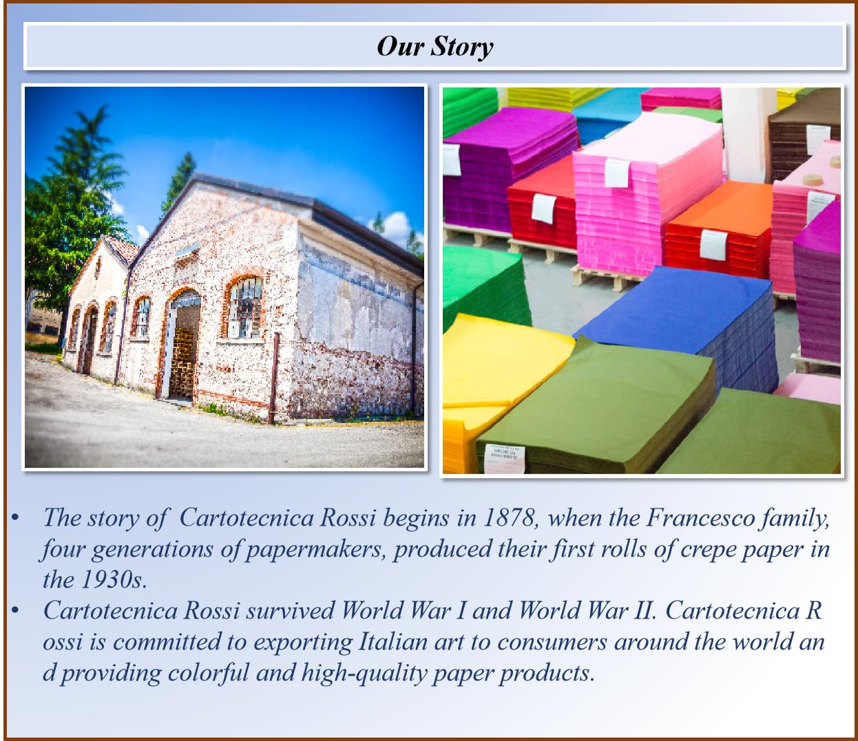 【From Italy, Since 1878】Cartotecnica Rossi Crepe Paper was originally taken over by founder Francesce Rossi, dedicated to the production and processing of fine and ultra-fine paper. Over time, this led to the birth of Cartotecnica Rossi. It can be defined as the mother of crepe paper, with 150 years of industry experience. The first roll of crepe paper was produced in 1930.
