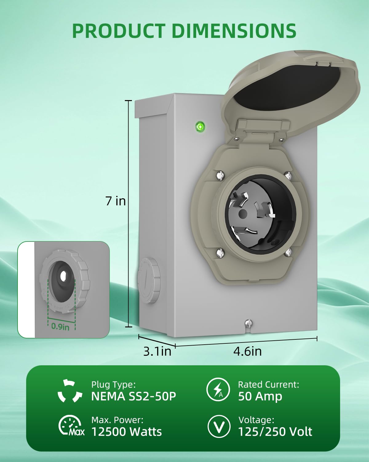 50 Amp Generator Power Inlet Box: This outdoor power inlet box supports 50 Amp SS2-50P generator cords, rated for 12,500W and compatible with 4-6 AWG wires. Its weatherproof and durable construction ensures safety and reliable performance in harsh weather conditions, making it ideal for emergency backup power during outages.