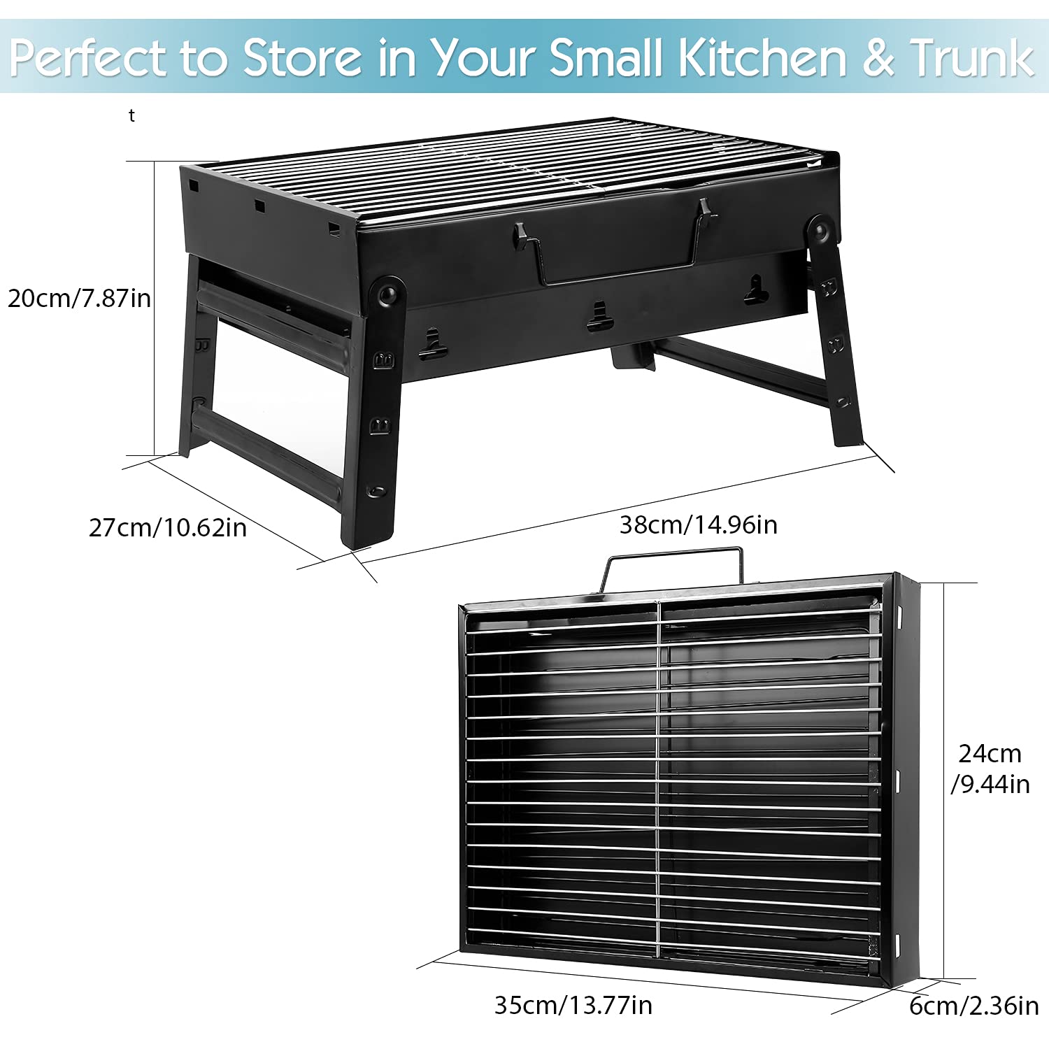 【Foldable & Portable Grill】:The portable charcoal grill is foldable.The legs are folded and stowed that it is small in size and lightweight. This small grill is easy to carry ,store and save space.Unfold the folded legs to support the grill in a triangular manner to make the grill more stable.