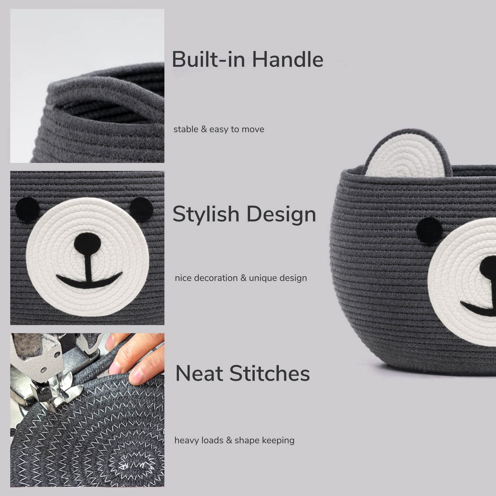 Cute Animal Basket: Made from soft coiled rope, this animal storage bin with a playful bear face, which is popular with many kids and families. This cutebasket can not only adapt to various home styles but also be a very cute decoration in a home