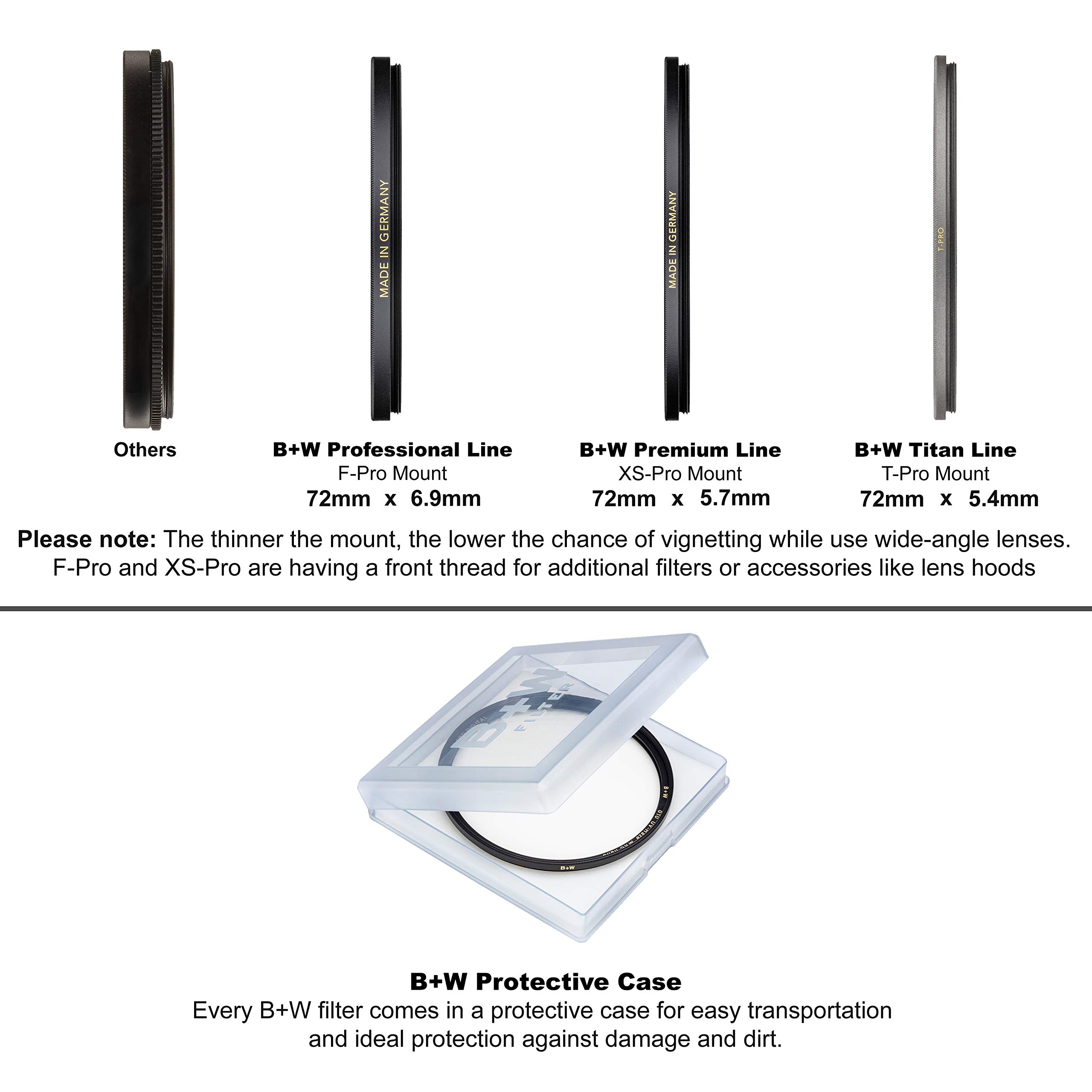 PROTECT YOUR EXPENSIVE CAMERA LENSES - The B + W 72 mm UV haze clear camera filter is here to add 16 multi-resistant nano-coating layers of protection against accidental drops, dust, flying, fingerprints, dirt, scratches sand or seawater spray. Enjoy outdoor photography without worrying about your precious lenses anymore.
