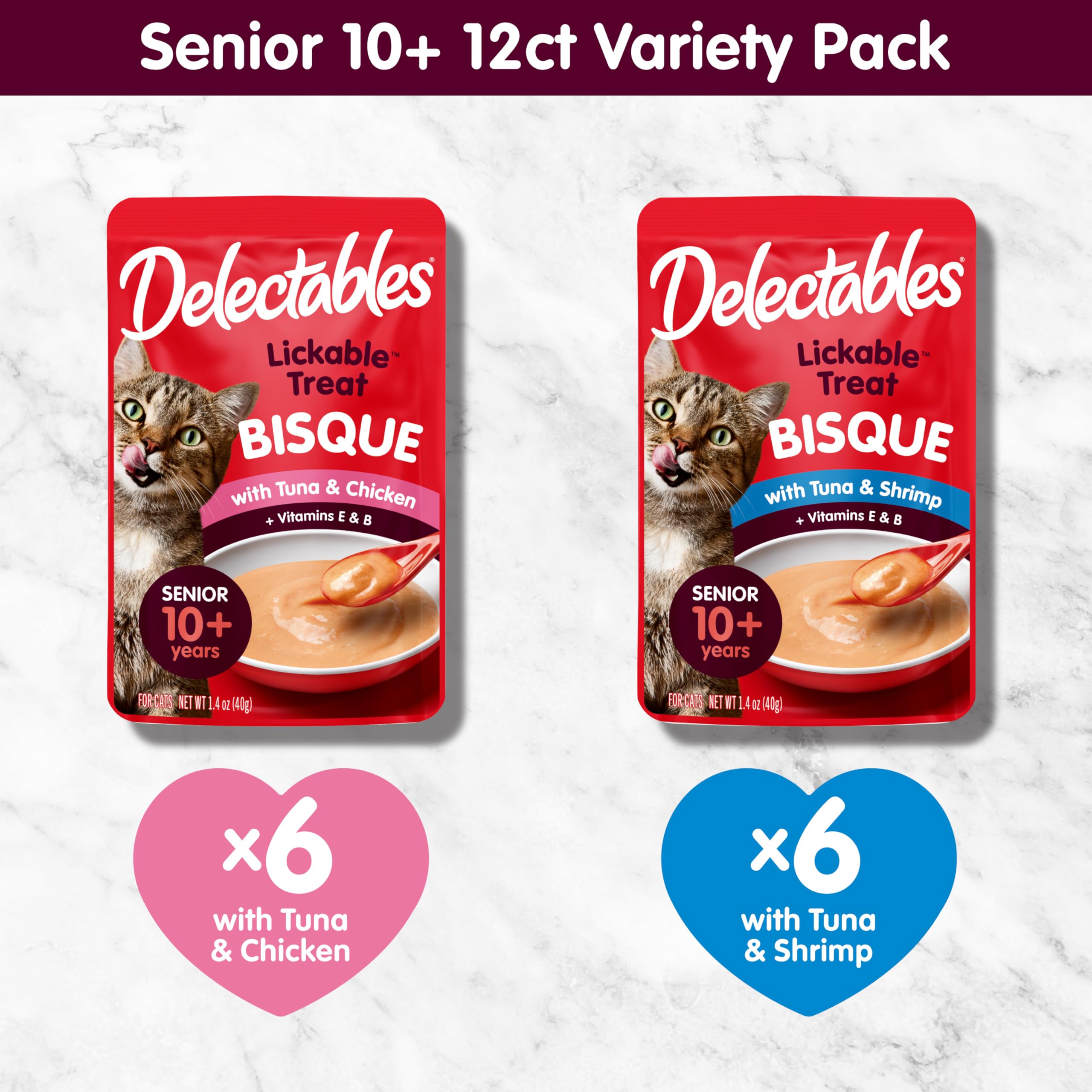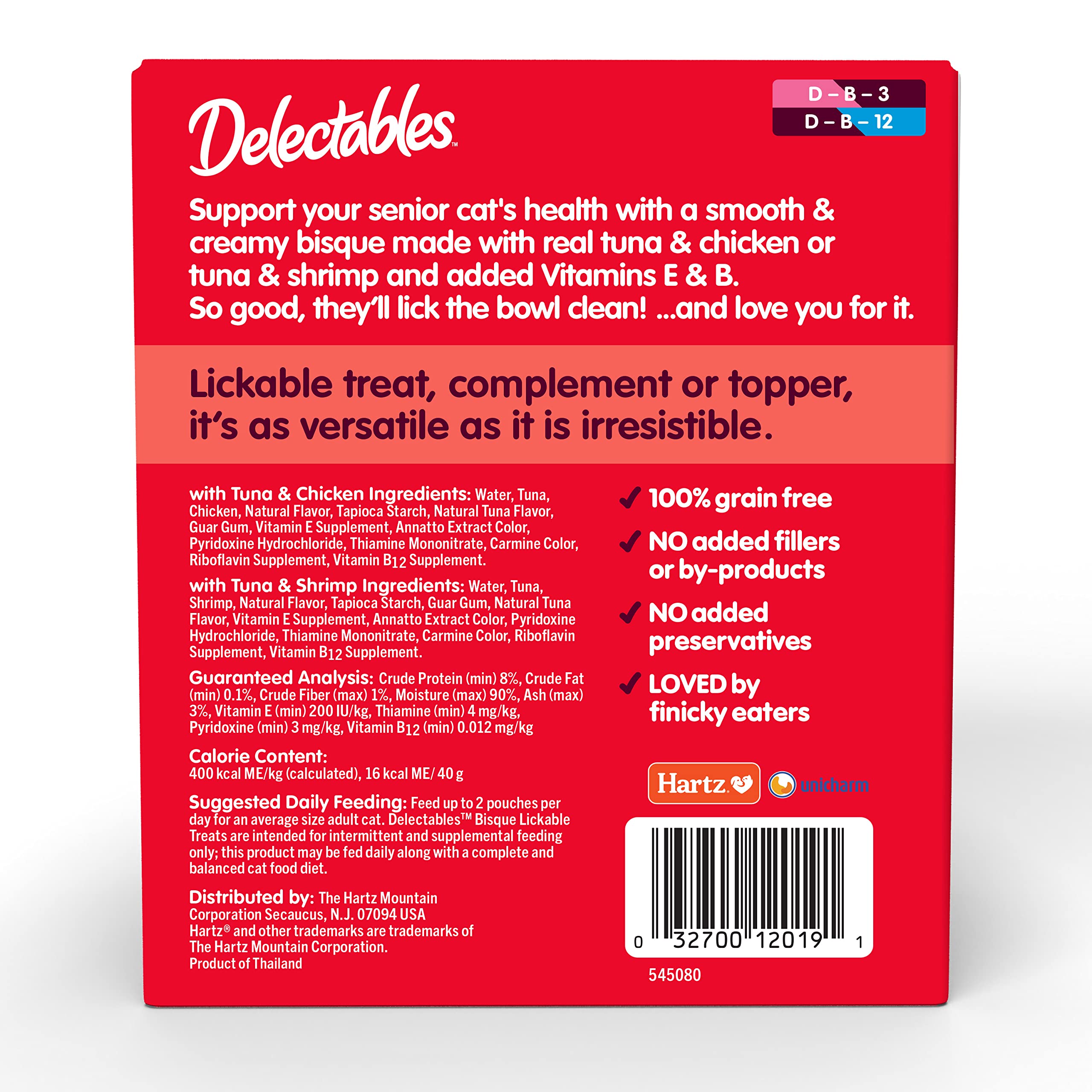 Delectables Lickable Treat Bisque features a unique combination of real, tender ingredients in a smooth & creamy bisque that'll have even the pickiest cats meowing for more! Crafted with premium cage-free chicken and/or wild-caught tuna & shrimp, these treats offer a perfect mix of delicious nutrition and hydration boost with vitamins E & B! This innovative recipe perfectly blends the sauce and high-quality protein, so your cat can savor every delicious lick without leaving a drop behind. Serve these versatile treats as a tempting food topper, a quick snack, or a special reward. Delectables Lickable Treats are guaranteed to make your cat feel loved and satisfied.