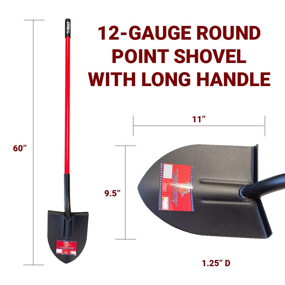 Bully Tools Round Point Heavy Duty Shovel - 12-Gauge Fiberglass Long Handle, Strong Metal Construction, Ideal for Gardening, Digging and Landscaping, Square and Flat Head Design - 100% Made in the USA