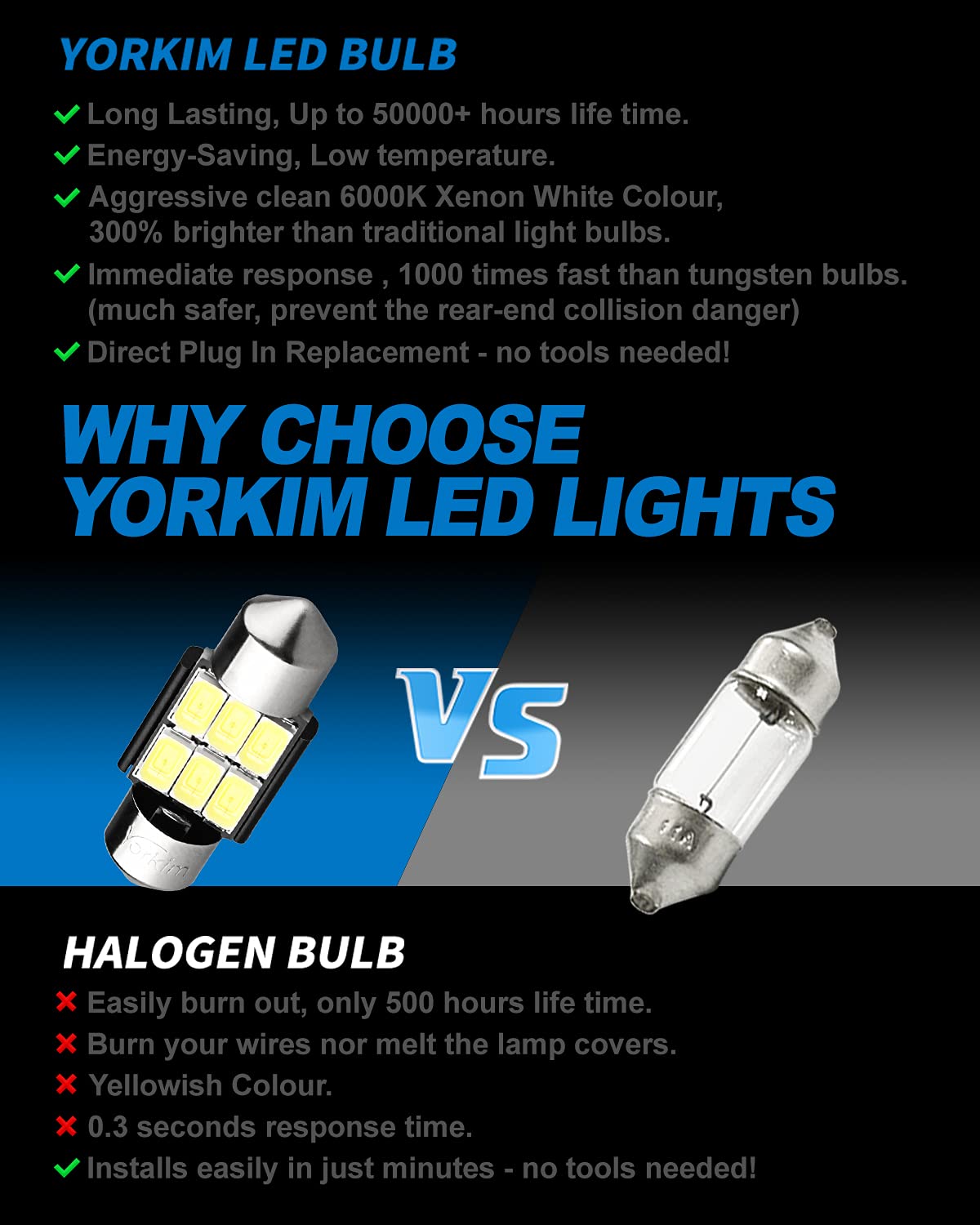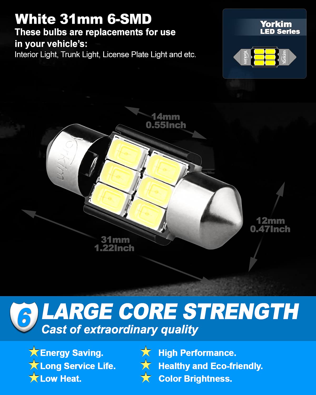 【ULTRA BRIGHT】 –Yorkim DE3175 LED light bulbs pack of 2, each bulb uses 6-SMD 5730 super bright chipsets, offers a brighter and modern look to your vehicle. 3 sizes to choose from: 31mm, 36mm, 41mm