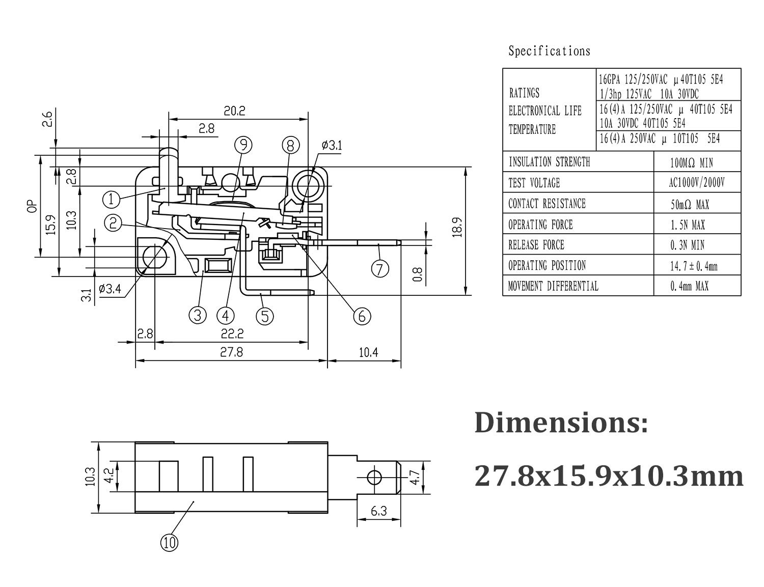 Specifications: 16(4)A 125/250VAC u, 10A 30VDC, 40T125, 5E4