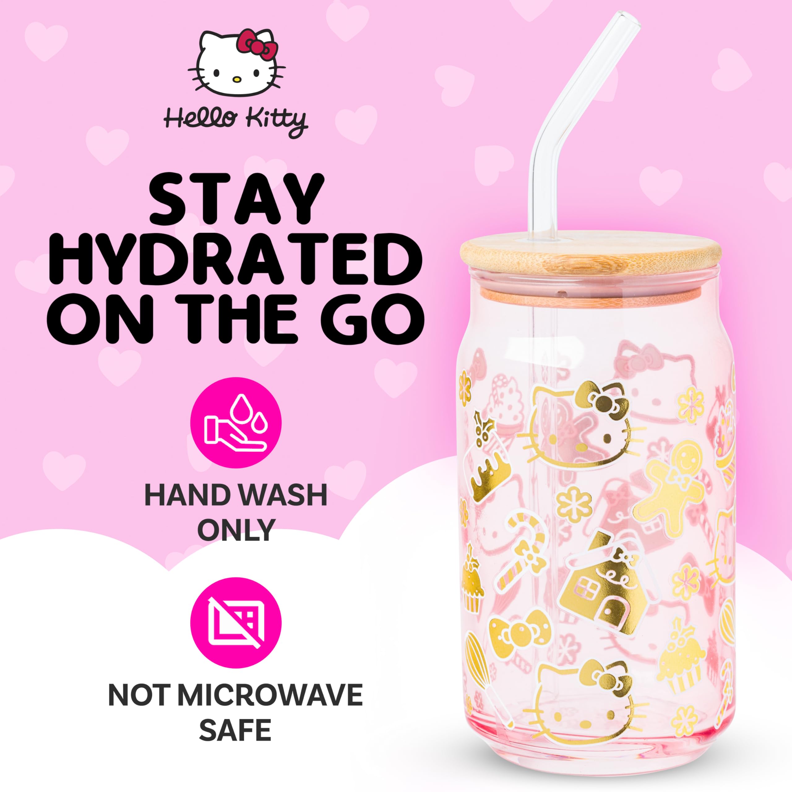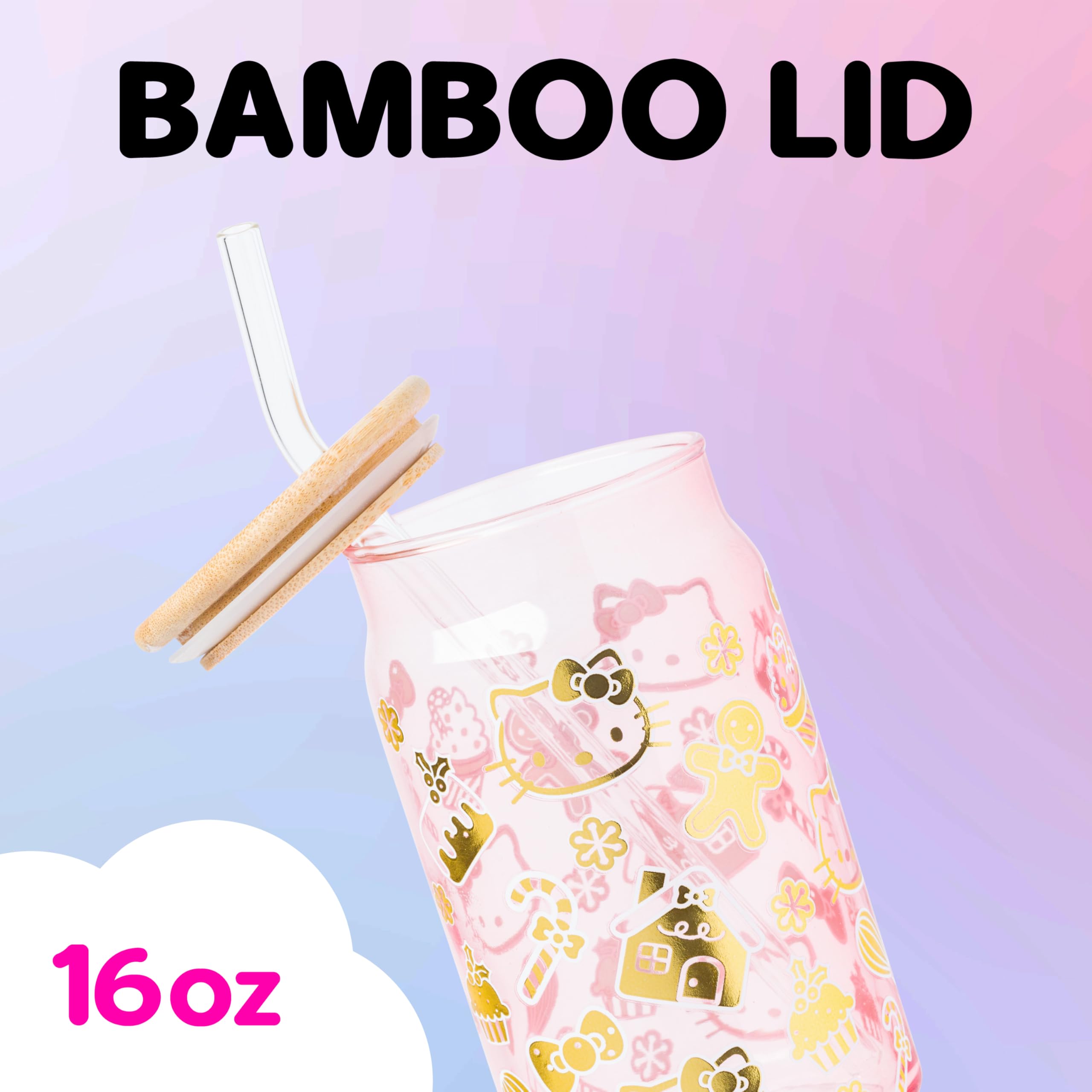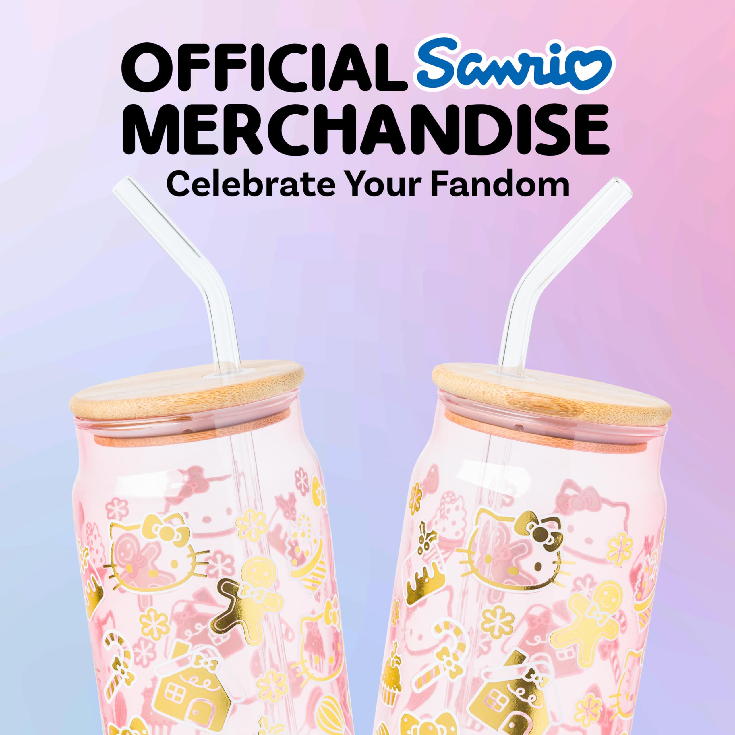 Celebrate the holidays with this Hello Kitty glass tumbler! Glass tumbler features various holiday images like candy canes, mistletoe, and gingerbread. Tumbler also features Hello Kitty and her iconic bow. Tumbler is pink. Glass tumbler is complete with a bamboo lid and reusable glass straw, promoting eco-conscious living. 16 ounce tumbler is perfect for enjoying any beverage. Complete with a secure bamboo lid and reusable glass straw, this is the perfect cup to bring on your daily adventures. HAND WASH ONLY. NOT microwave safe. Looking for a gift? With its festive design, this glass tumbler makes a great gift for Hello Kitty fans of all ages. Great for holidays, birthdays, and housewarmings. Take a dive into the fictional world with Silver Buffalo! Silver Buffalo provides fans with official merchandise from their favorite characters. Working alongside licensors and brands, we create unique and imaginative products which are designed with great care and detail. Silver Buffalo aims to connect fans to their favorite cartoon characters, superheroes, movies, tv-series, and more. Celebrate your fandom!