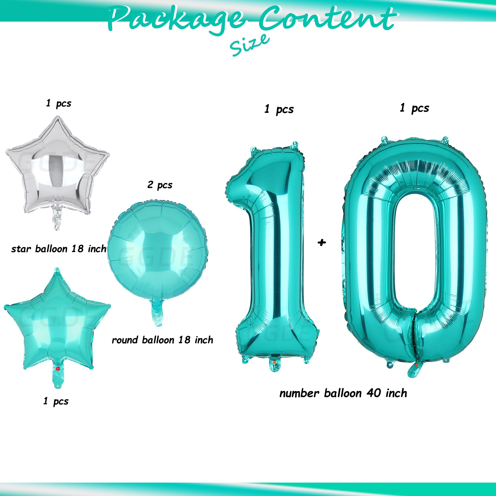 Package/Size: 1 pcs 40 inch teal number balloons 1+0,2 pcs star balloons (silver,teal),2 pcs round balloons (teal).