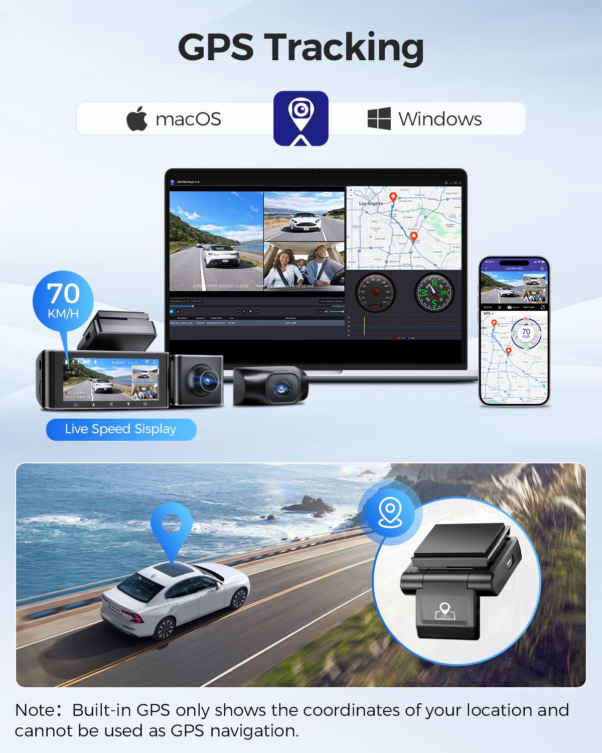 Built-in WiFi & GPS: The M550 dashcam features built-in WiFi for seamless compatibility with the AZDOME app, enabling instant access to videos recorded in the car dash cam and photos on your phone. Share your travel moments effortlessly while on the go. Additionally, the built-in GPS tracks your driving route and location through the app or AZDOME GPS Player, providing essential evidence in case of accidents