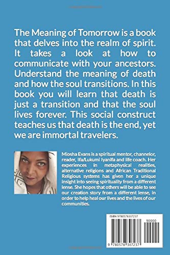 The Meaning of Tomorrow is a book that delves into the realm of spirit. It takes a look at how to communicate with your ancestors. Understand the meaning of death and how the soul transitions. In this book you will learn that death is just a transition and that the soul lives forever. This social construct teaches us that death is the end yet we are immortal travelers. he Meaning of Tomorrow teaches us that we are able to communicate with with our ancestors through genetic memory, intuition, dreams, channeling and divination. This book will allow you to understand the metaphysical aspects of the body, death and spirit and how they all work together energetically. We learn that the spirit or collective beings operating within the body. The ancestral collective is honored and revered through altars, and offerings.