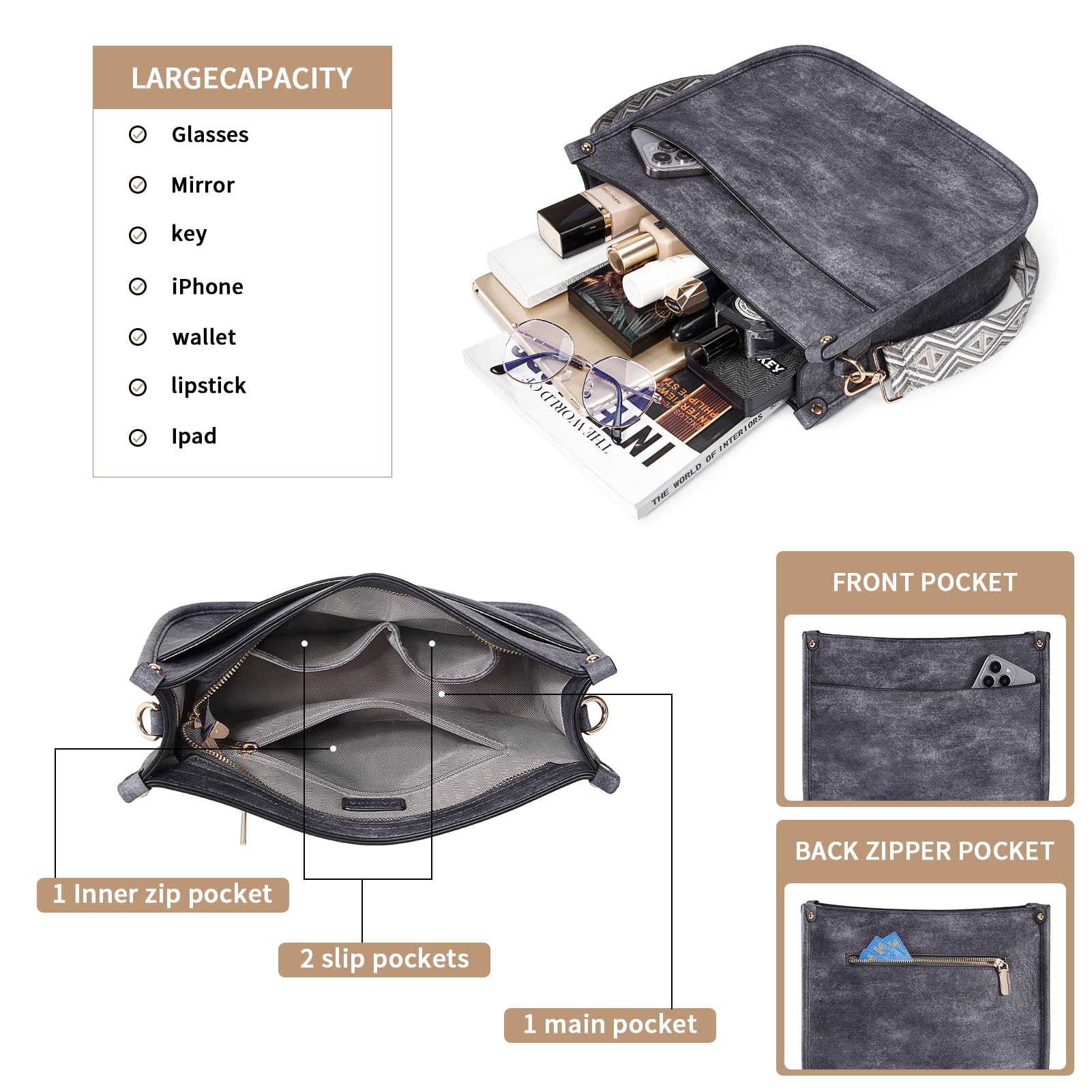 Crossbody Bag Structure:Internal structure is one main compartment including 1 main pocket,1 inner zipper pocket,2 slip pockets-cell phone pocket and ID card slot.External structure including 1 metal magnetic buckle pocket and 1 back anti-theft pockets,come with metal zipper closure,main pocket and back pocket antitheft zipper design-double antitheft to protect your property safety