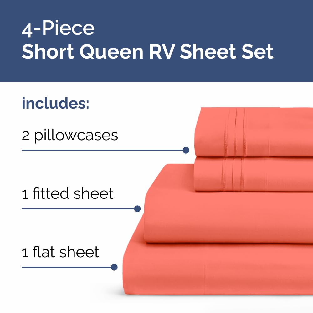 4 PIECE RV SHORT QUEEN SHEET SET: This RV Short Queen sheet set stays perfectly in place whether it is for a RV Short Queen Mattress or RV camper. It includes 2 pillowcases 20” x 30”, a Flat sheet 90” x 102” and a Fitted Sheet 60” x 75”. Our premium RV Short Queen sheets will allow you to enjoy a smooth, wrinkle-free bed without the hassle of constant adjustments or re-tucking.