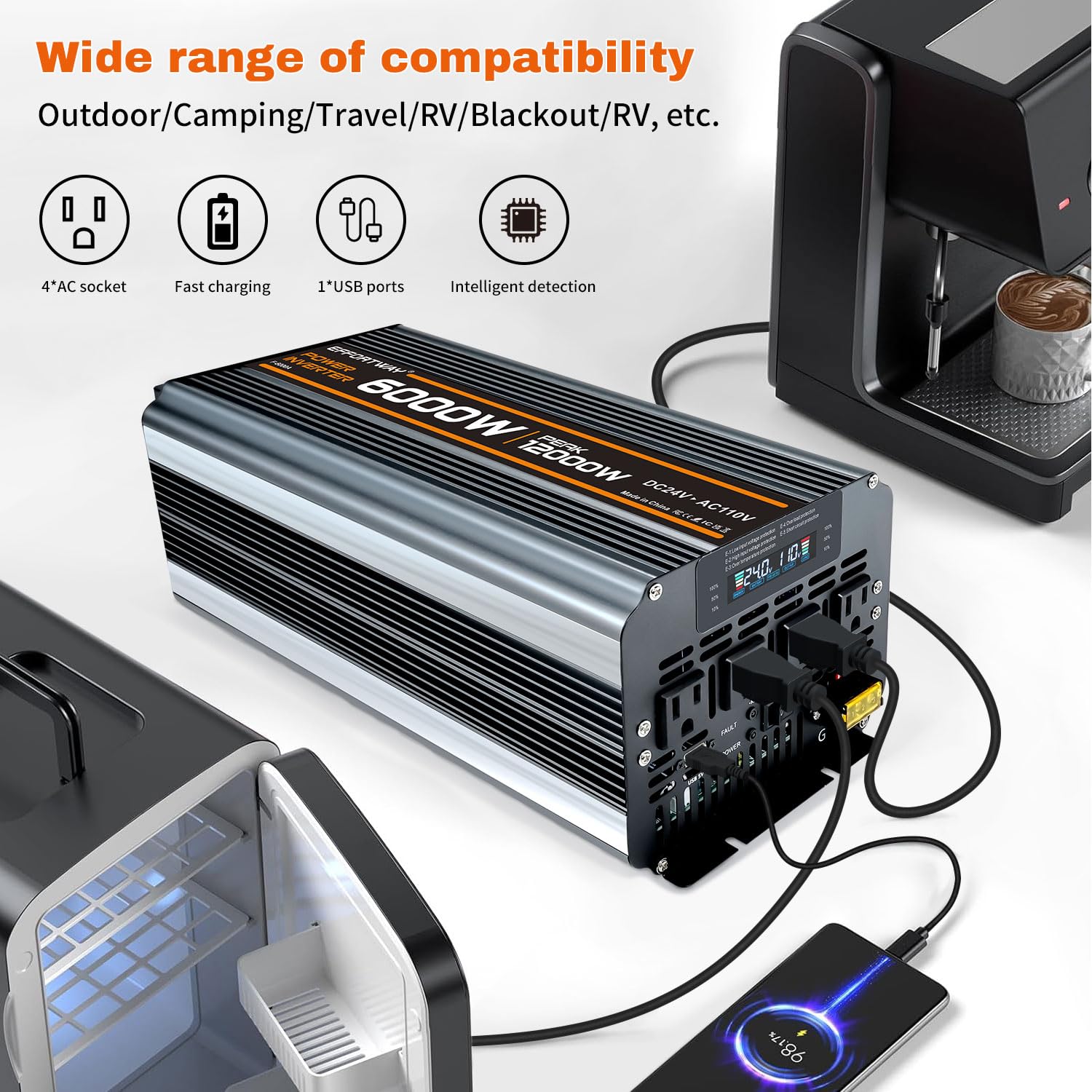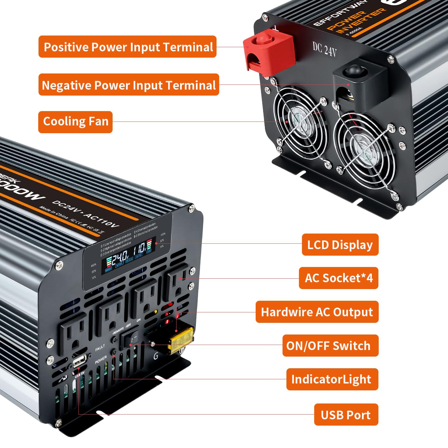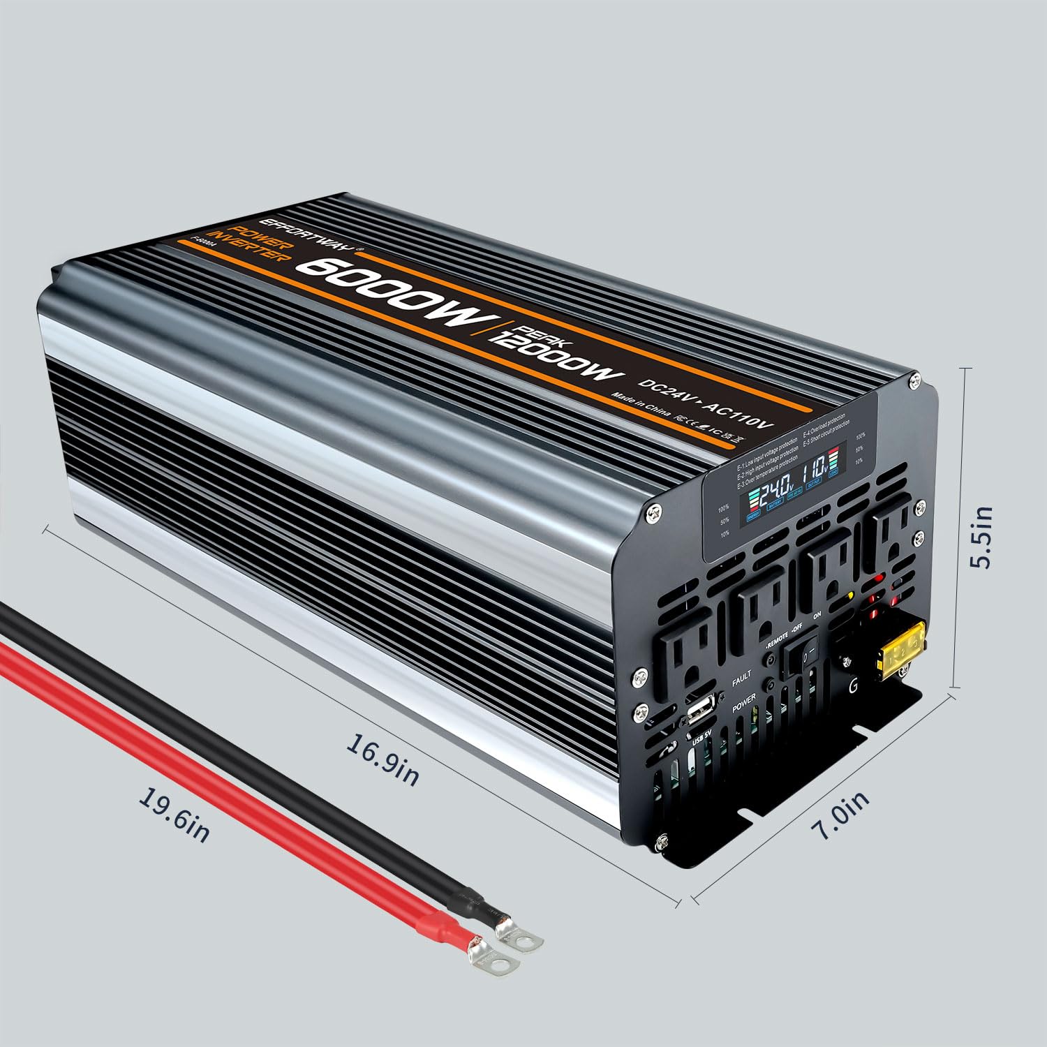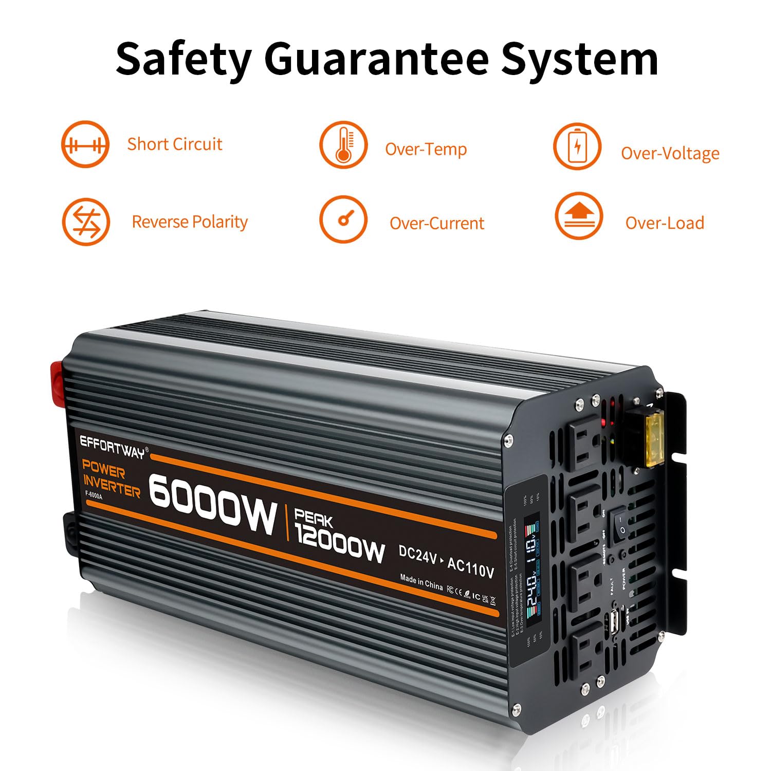 6000w power inverter 24v to 110/120v: Provides a stable 6000W continuous power and 12000W peak power to easily convert power from DC 12V to AC 110V/120V 60HZ. with more efficient conversion (>90%) Ideal for RVs, motorhomes, trucks and off-grid solar systems