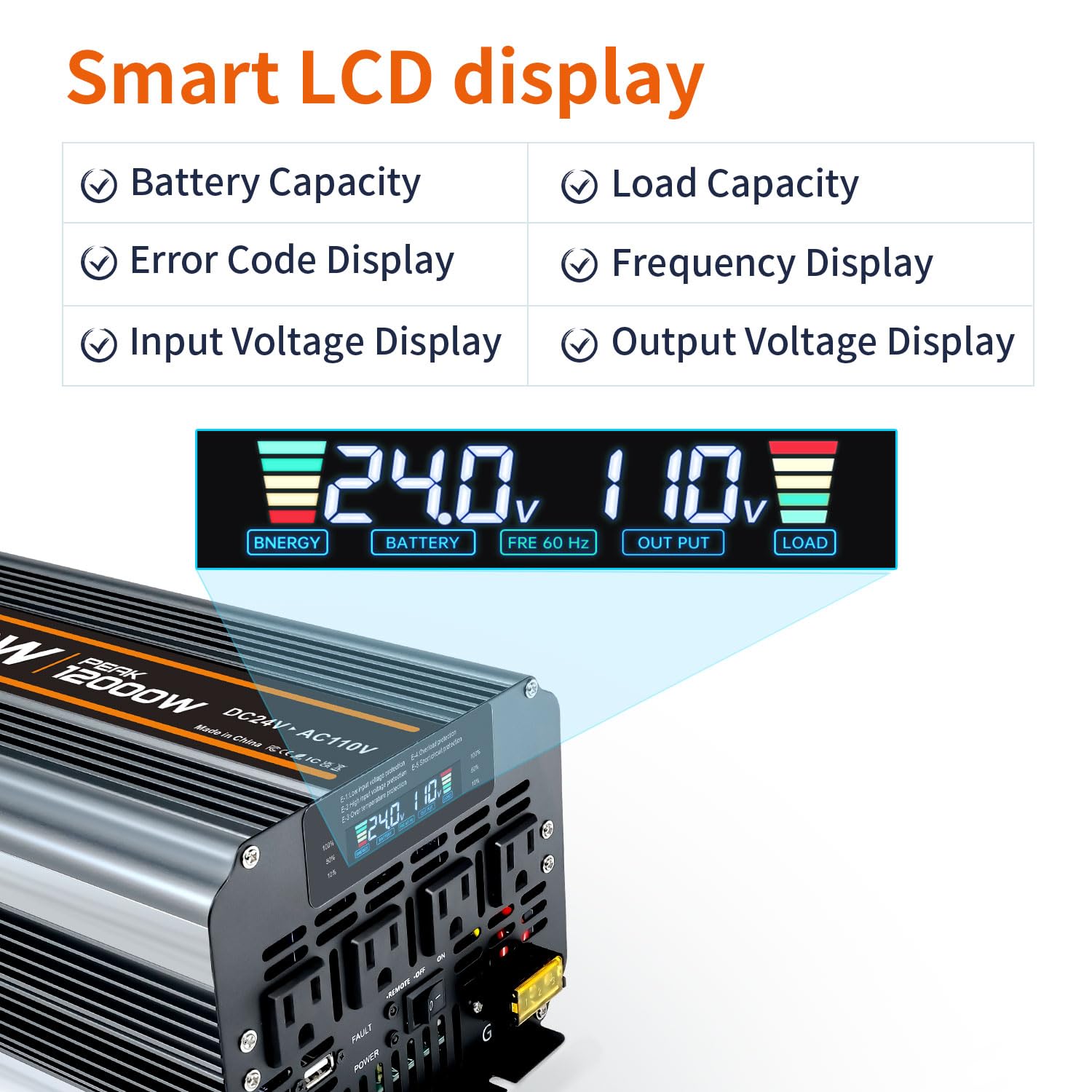 REMOTE CONTROL AND LCD DISPLAY: The Power converter with remote control and LCD display. LCD display can show: input/output voltage, battery capacity, load capacity, error code. Easily and intuitively track the operating status of all inverters to make troubleshooting easier.16 feet wireless remote control distance make you enjoy a convenient power life anytime and anywhere. Tips: (Before using the remote control to turn on the inverter, you must make sure the inverter itself is switched off, then use the remote control to turn on the inverter)