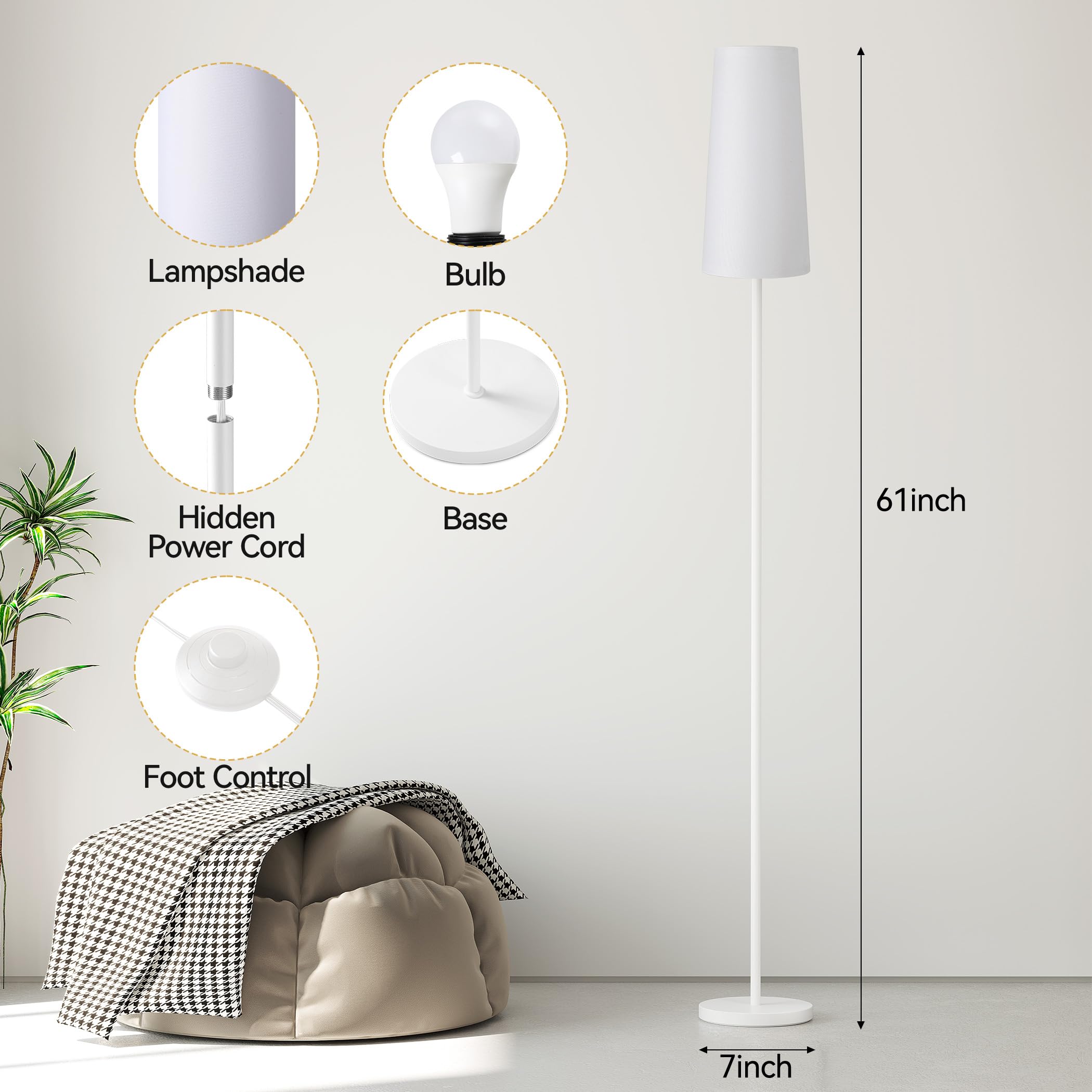 High-Quality Build: Floor lamp crafted with high-quality materials to ensure lasting durability. Floor lamp for bedroom features a weighted base that provides exceptional stability. An extended power cord and convenient foot switch add to its practicality.