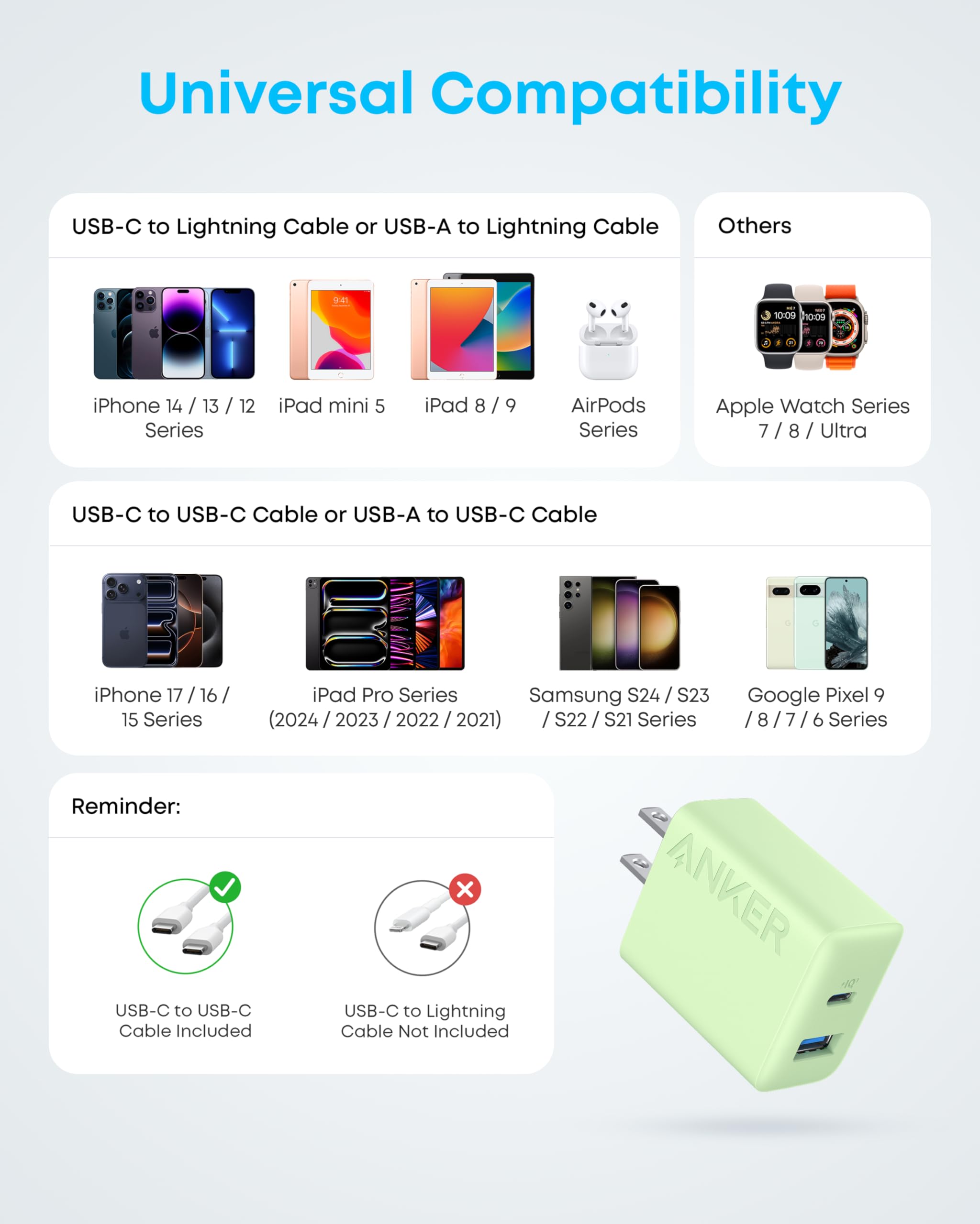 hat You Get: Anker Charger (2-Port, 20W), 2-pack 5 ft USB-C to USB-C cable, welcome guide, 18-month warranty, and our friendly customer service.