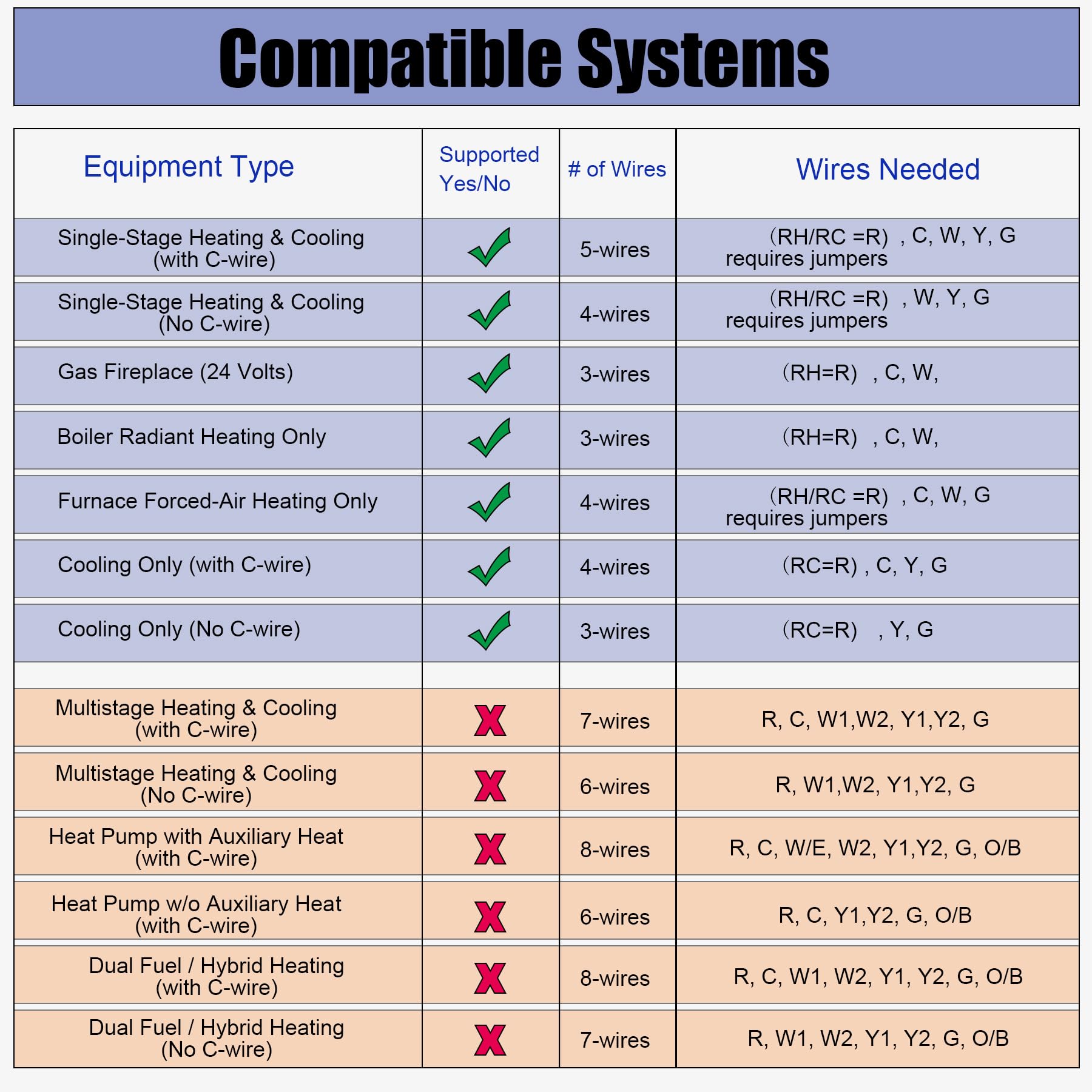 ❌ 【Clearly Incompatible Systems】Not suitable for multi-stage HVAC systems (2H/2C, 3H/2C), HVAC heat pumps systems(2H/1C, 2H/2C), PTAC units, 3-wire hydronic (hot water) heating systems, dual fuel/hybrid heating systems; Does not support 120-240V line voltage systems, mini-split heat pump air conditioners, RV air conditioners (Mach/Roughneck series)