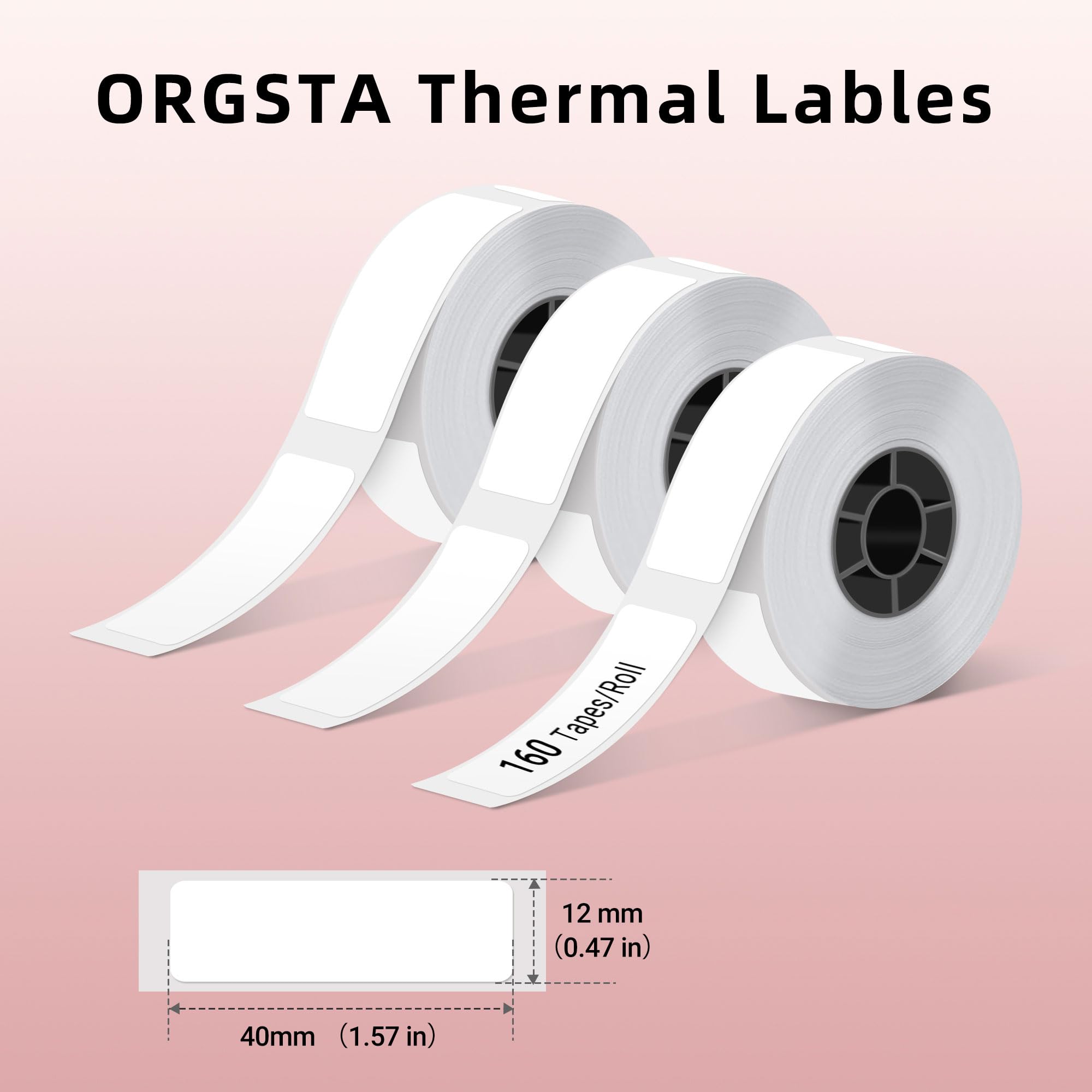 Direct Thermal Label Tapes: This set includes 3 rolls of label paper, with 160 labels per roll; Each label measures 0.47" x 1.57" (12 x 40 mm), white; Perfect for direct thermal printing, these labels offer sharp, smudge-free results without ink or toner