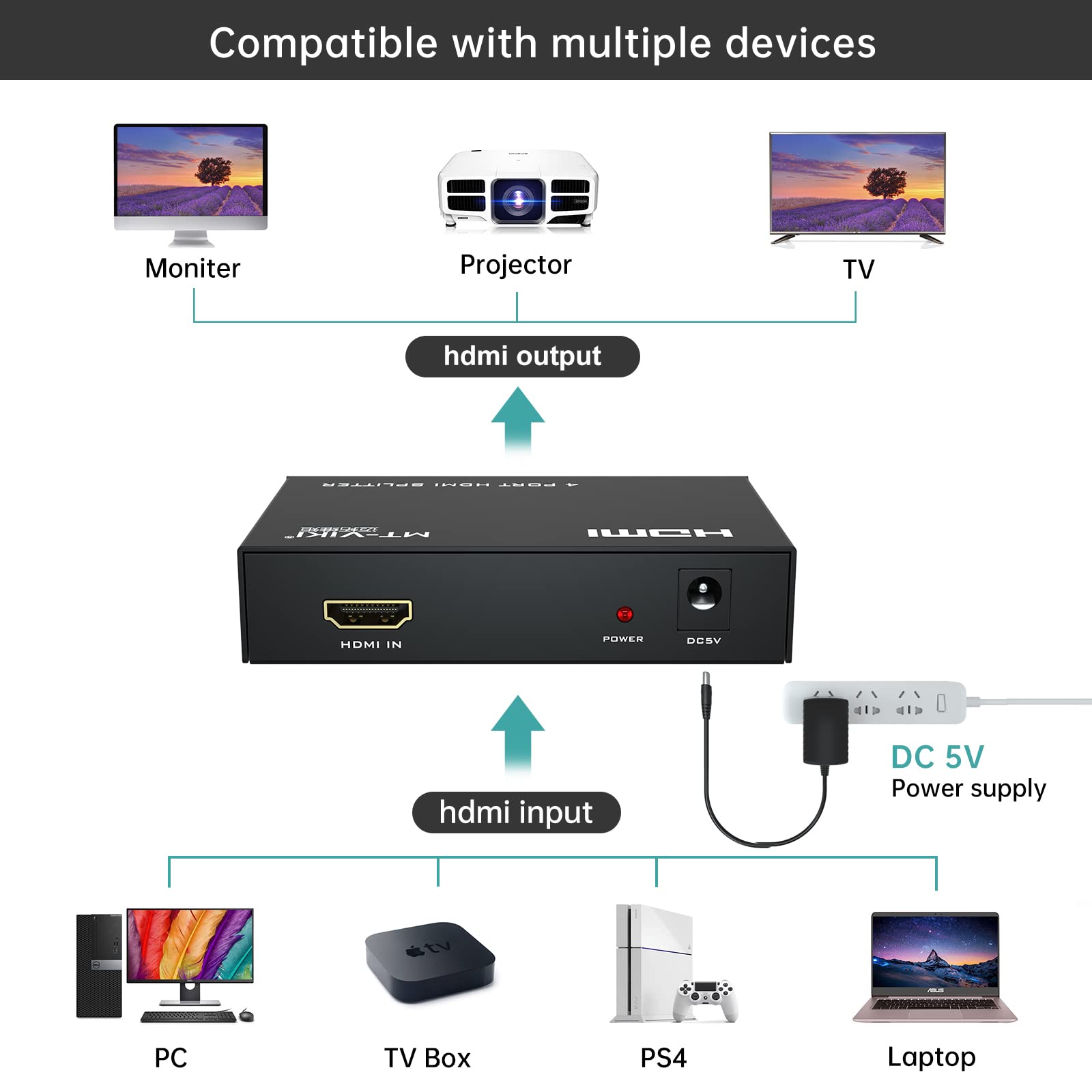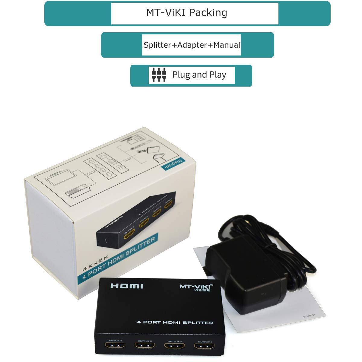 Package: HDMI Splitter 1 in 4 out *1, 5V1A Power adapter*1; Warn Noted: If no display after connected, pls help to check if connected reversely.