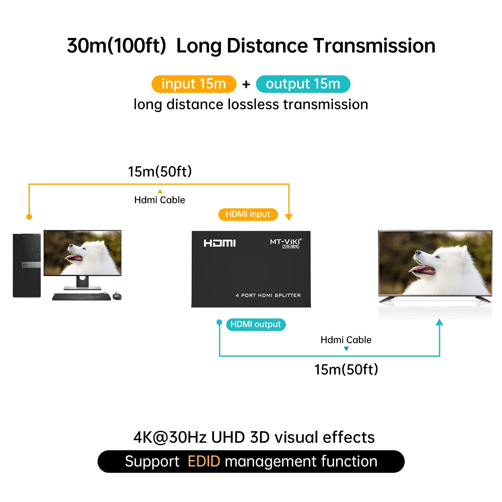 Resolution: 4 way hdmi splitter supports resolution 4Kx2K@30Hz, Full HD 1080P, 3D, deep color 8/10/12 bit; Supported DTS-HD, Dolby-trueHD, DTS, Dolby-AC3, DSD etc; Plug and play, no software required. Please note that the input/output device must support 4K in order to display 4K resolution.