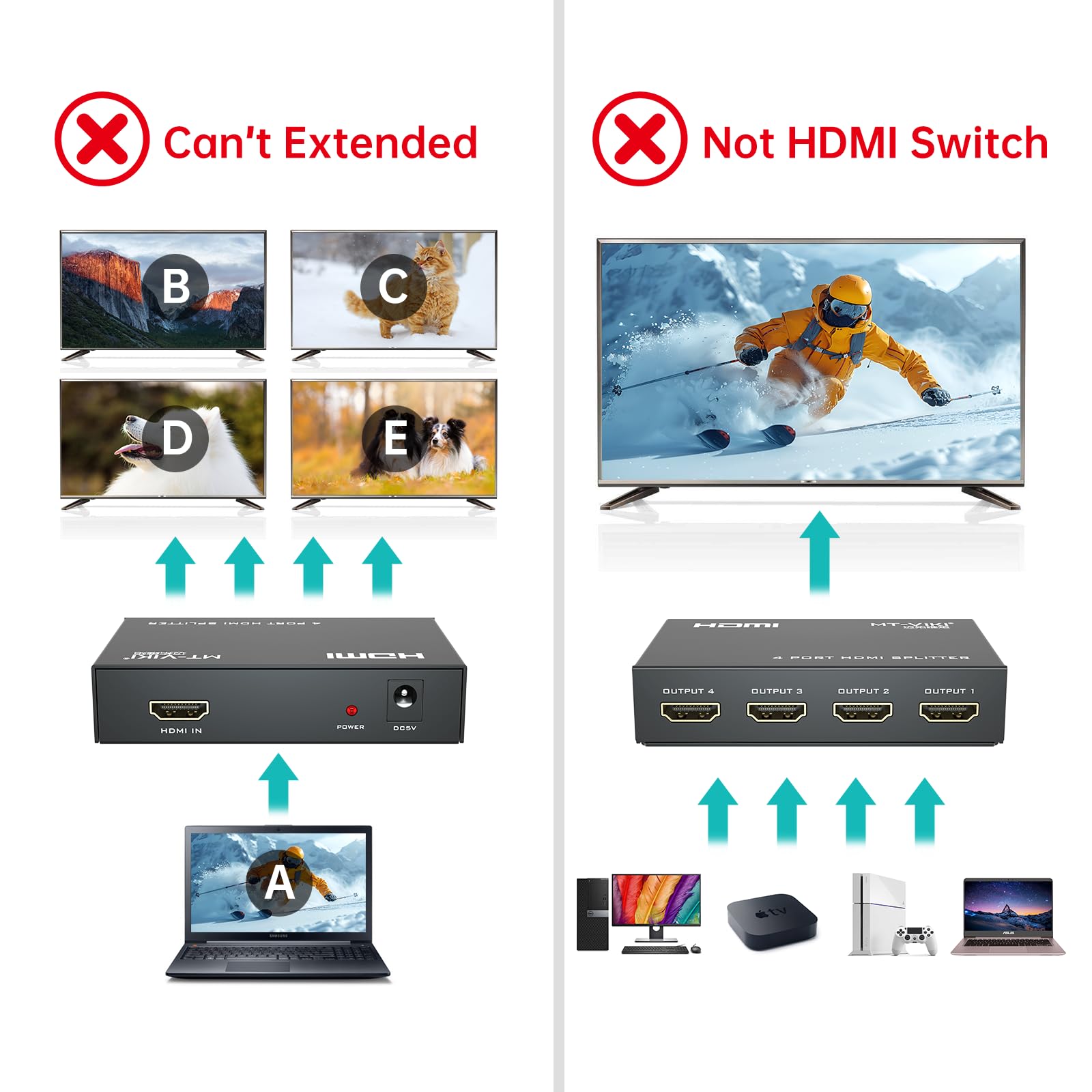 IMPORTANT 2: This HDMI Splitter CAN'T support Extend screen, ONLY can mirror or duplicate one signal to 4 TVs, Display the same contents. (Support A-AAAA mode, Can't support A-ABCD mode)