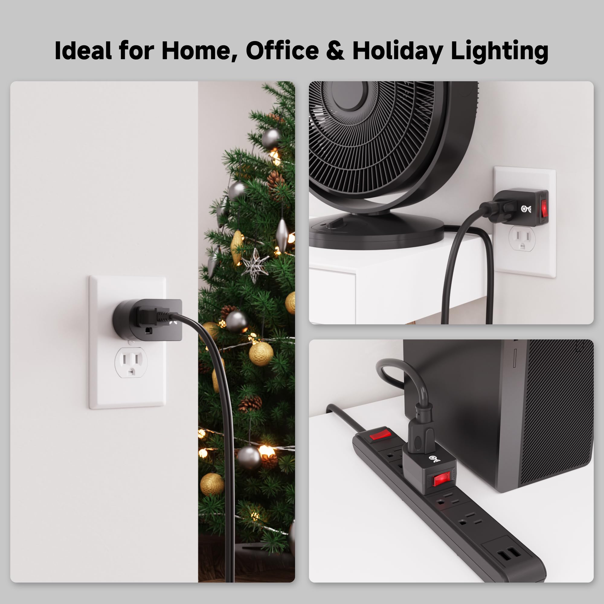 Universal Compatibility: Designed for both 3-prong grounded and 2-prong polarized cords. Plug in special occasion lights, holiday decorations, or any small appliances and control them easily with the ON/OFF switch. Works with 120V outlets and compatible with grounded outlet adapters for added versatility.
