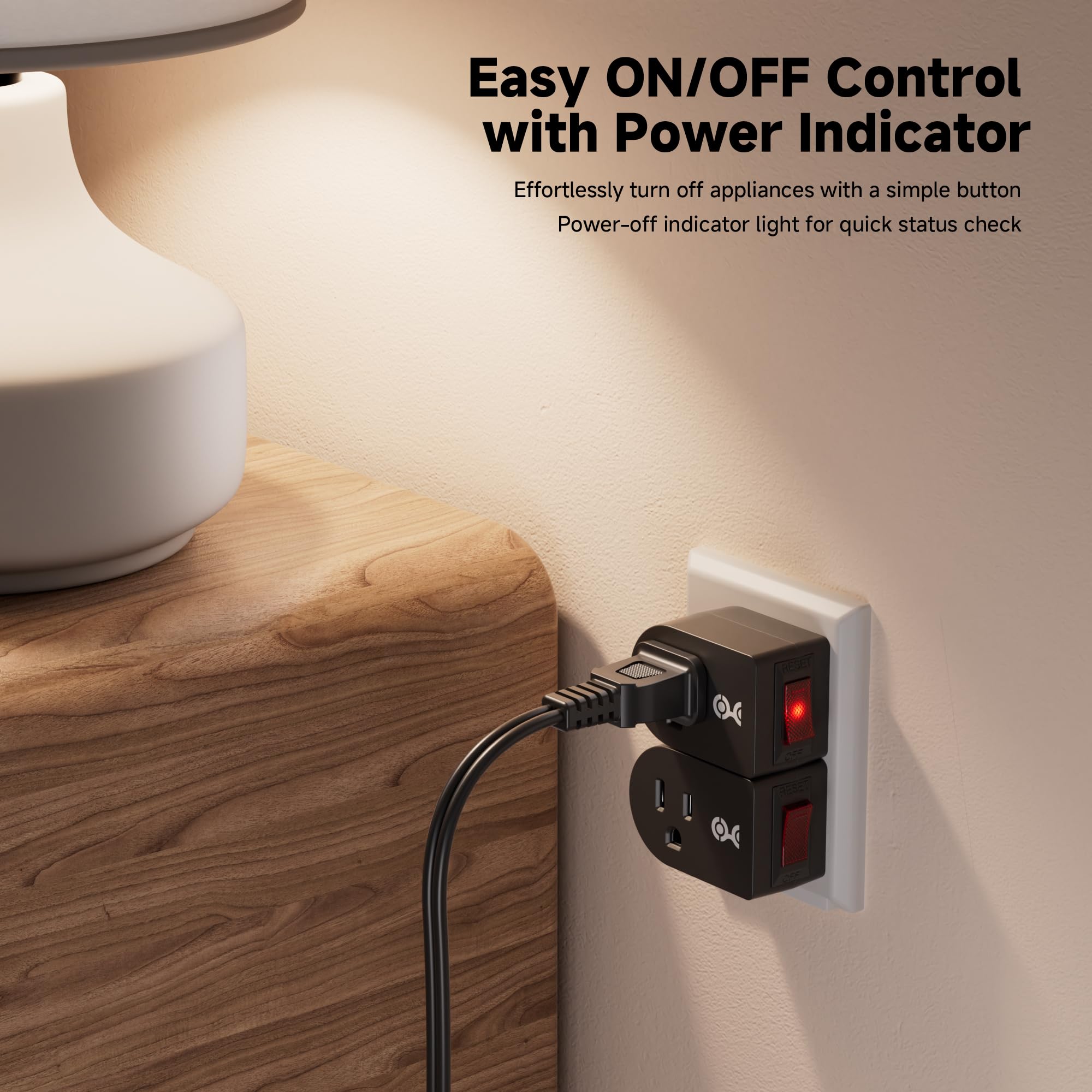 Power Status Indicator Light: The built-in light turns on when the outlet is supplying power and off when power is cut. Easily check the status at a glance—no need to unplug cords. Just use the ON/OFF switch for outlet to control the grounded single-port adapter.